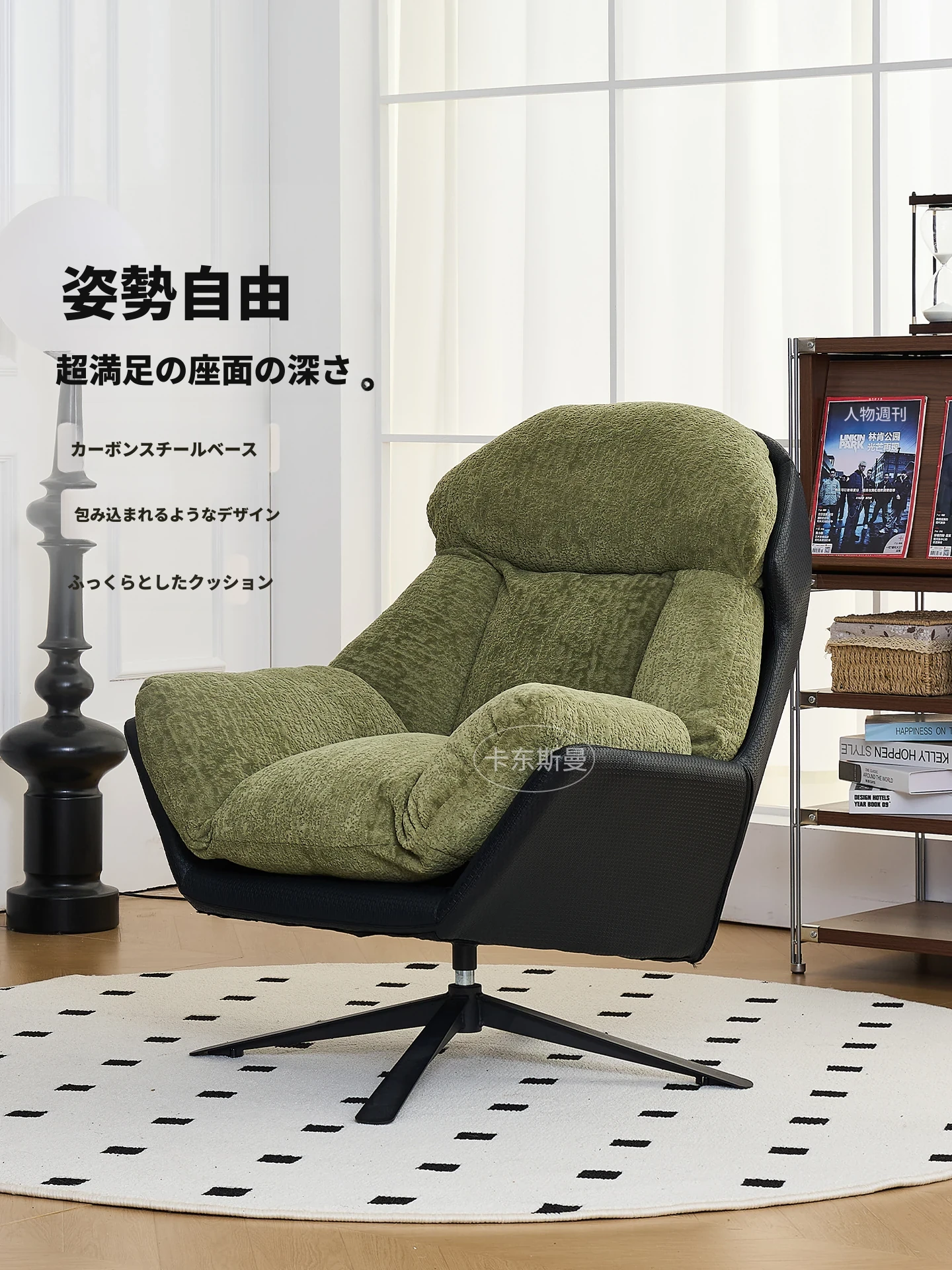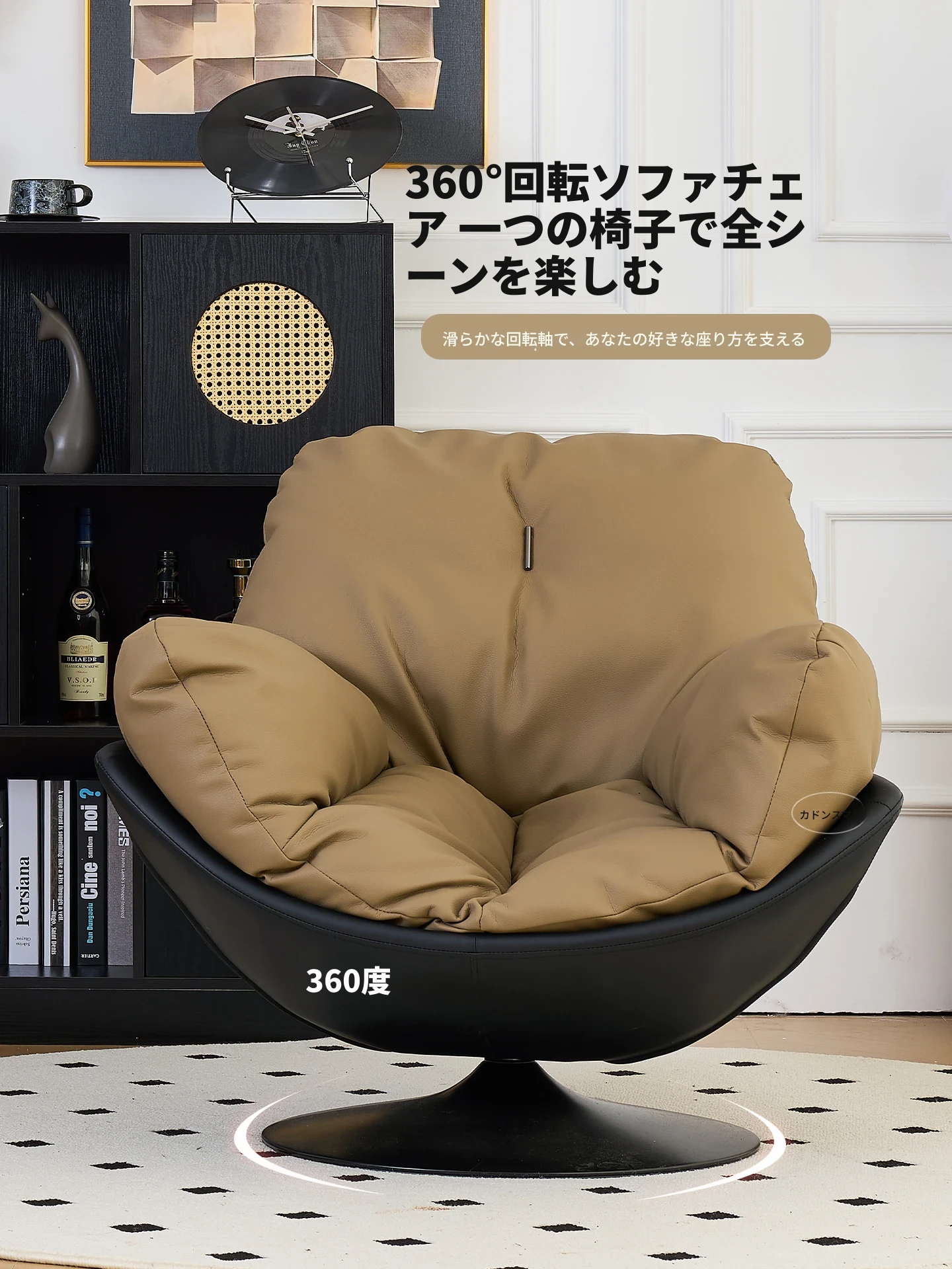 ラグジュアリーな一人用ソファチェア - リビングやバルコニーに最適!360度回転するデザインで、リラックスした時間を提供するデザイナーソファ。快適さとスタイルを兼ね備えた、贅沢なひとときをお楽しみください。