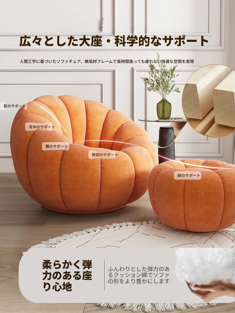リラックスできる!寝転びながらくつろげる小型リビング向け南瓜型ソファチェア。おしゃれなインスタ風デザインで、テクスチャーも抜群のフワフワ素材。快適さとスタイルを両立させた一人用ソファです!