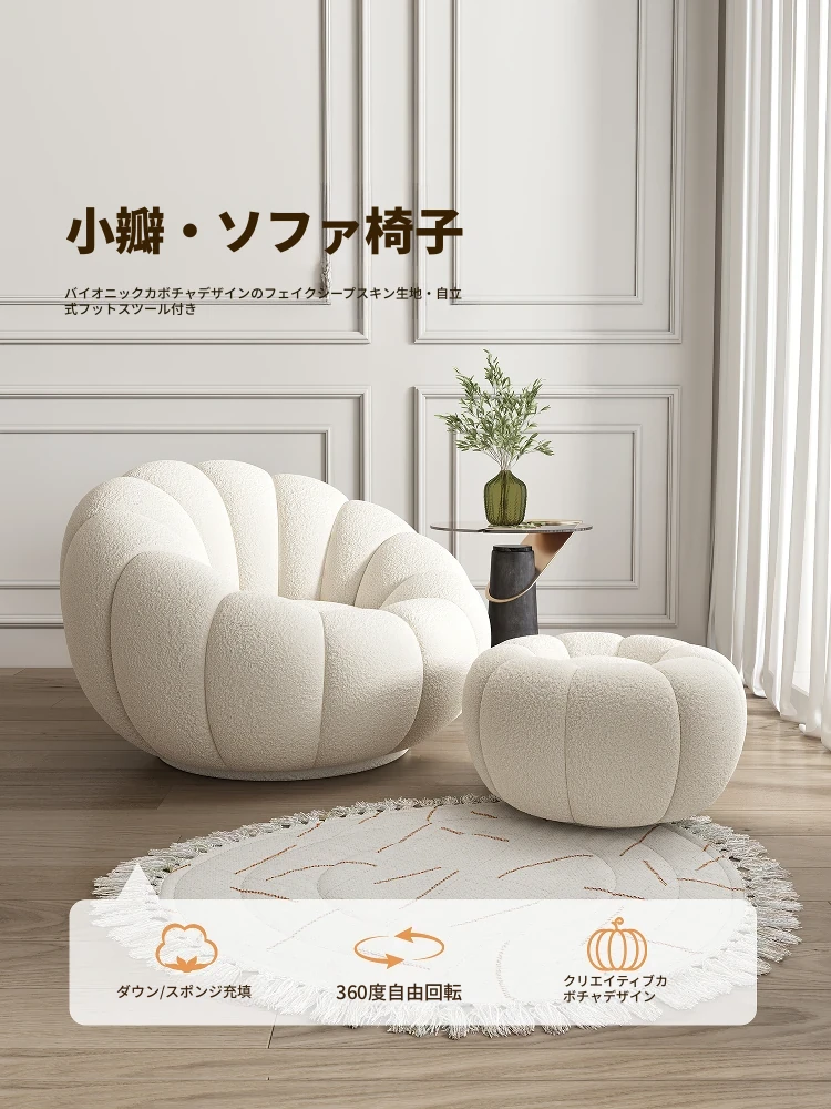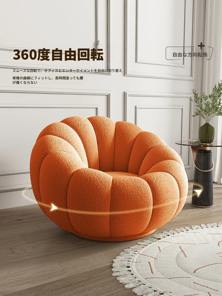 リビング用カボチャ型ラウンジソファ!南国風のクリーミーなラムファー製、バルコニーでくつろぐための回転式一人用チェア。心地よいリラックス空間を演出し、あなたの毎日を特別にします!