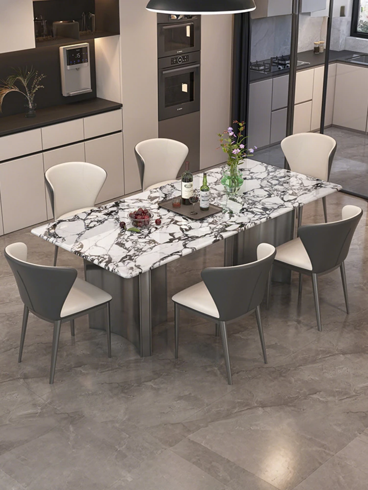 天然ミクロクリスタル石製ダイニングテーブル新作!イタリアンミニマリズムで軽やかなラグジュアリー感を演出。高級大理石使用のリビング向け、スタイリッシュなダイニングテーブル&チェアセット。
