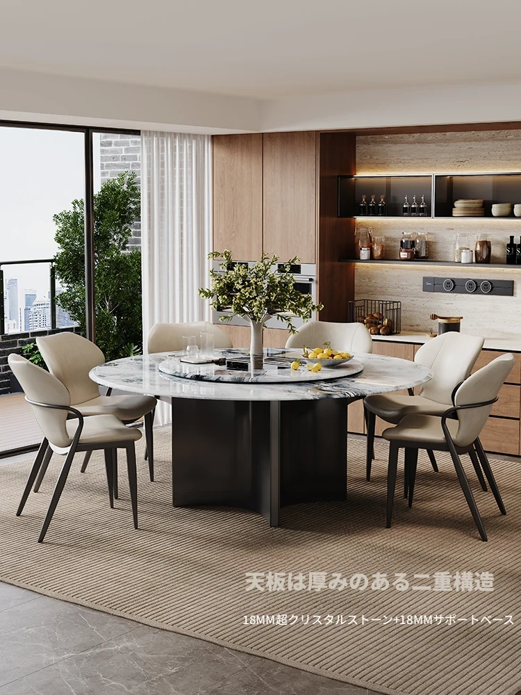 天然輸入の高級カルナバルアイスジャスパーのダイニングテーブル。イタリアンミニマリズムを体現したラウンドマーブルテーブルで、軽やかなラグジュアリー感を演出。高級感あふれるダイニングチェアとセットで特別な食卓を。
