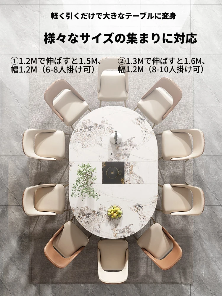 伸縮可能なエレガントな楕円形の多機能岩板ダイニングテーブル - 小さなスペースにも最適なモダンでシンプルなデザイン、電磁調理器対応でお手入れも簡単!あなたの家に洗練された雰囲気をプラスします。