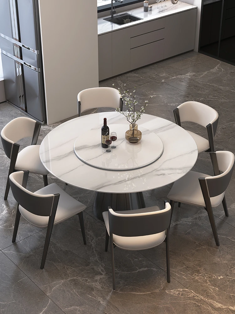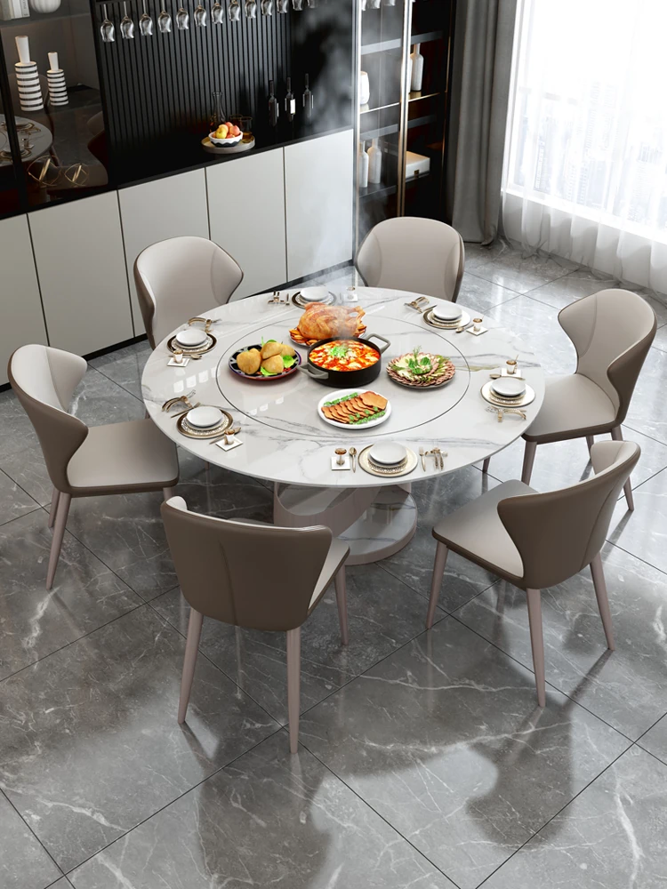内蔵回転盤付きの岩板円卓|現代的でシンプルなデザインの小型家庭用ダイニングテーブル|軽やかなラグジュアリー感あふれる円形のIH対応|スタイリッシュなダイニングチェアセット付き