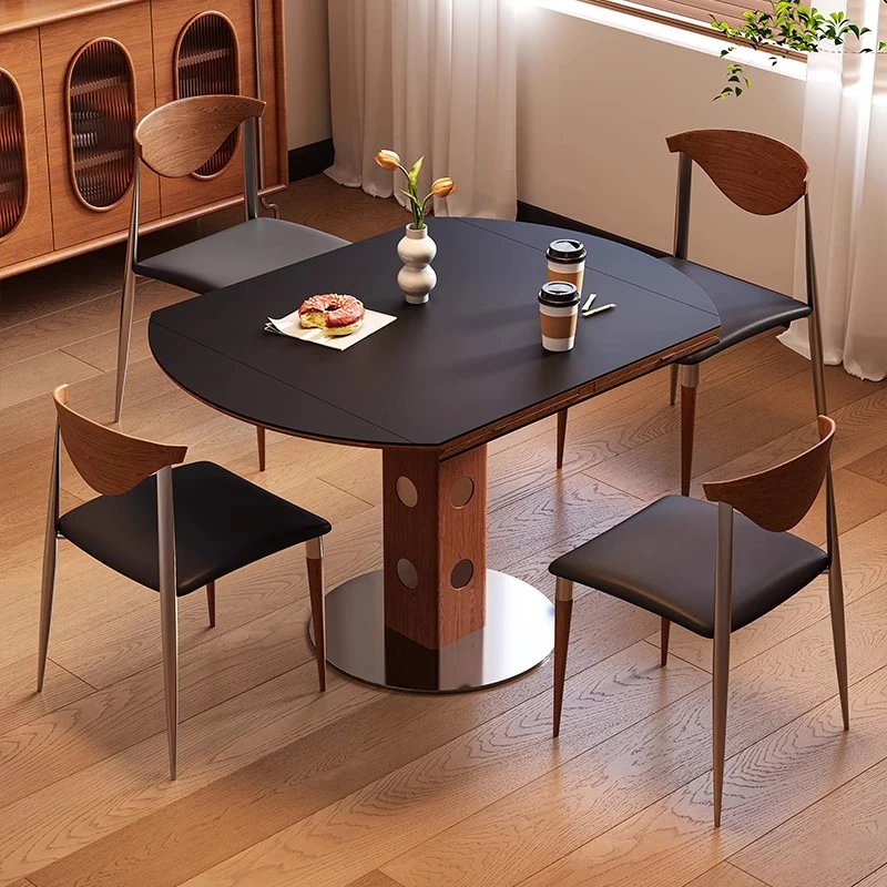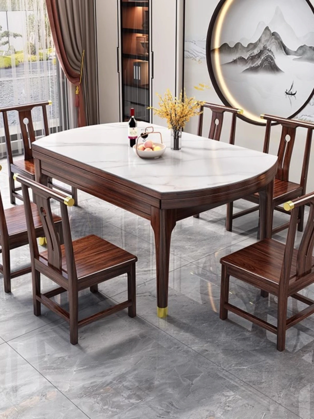佛山新中式ウッディーベースの高級ウッド岩板ダイニングテーブル&チェアセット - スタイリッシュでコンパクト、小スペースにも最適な伸縮可能な四角形&円形両用テーブル!