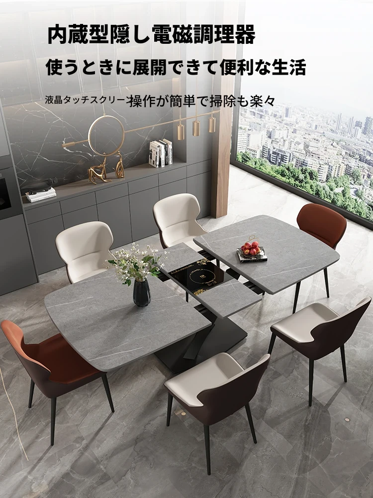 軽奢スタイルの伸縮式岩板ダイニングテーブル|小型住宅に最適な現代的なシンプルデザイン|多機能電磁調理器対応の折りたたみテーブルで、スペースを有効活用!