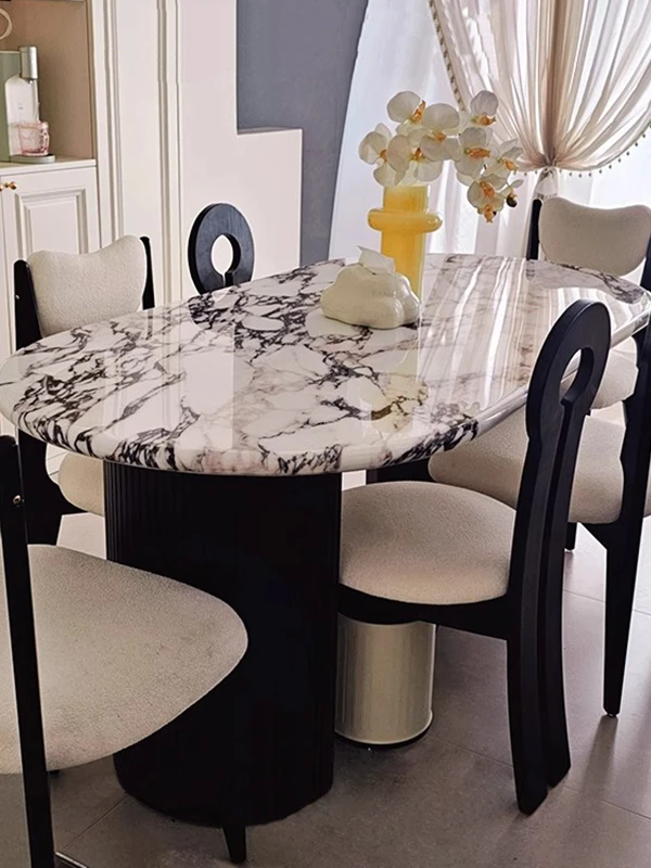 フランス風大理石オーバルダイニングテーブル - モダンでシンプルなデザイン、コンパクトな小型住宅に最適!高品質な無垢材を使用したテーブルと椅子のセットで、食事タイムを特別なものに。