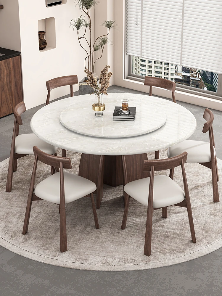 天然カルリ氷玉の贅沢な木製ダイニングテーブル - ヴィンテージスタイルの円形テーブル、回転プレート付き、輸入大理石のテーブルと椅子のセット。おしゃれで高級感あふれる食卓を演出!