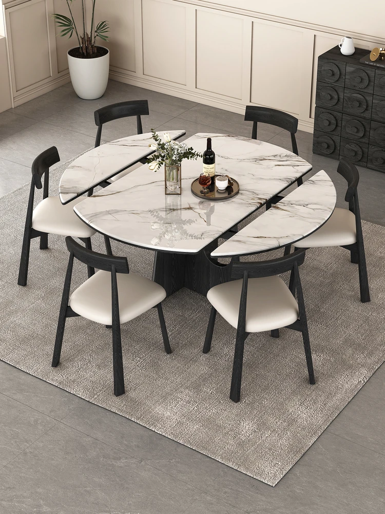 天然微晶石使用の伸縮可能な高級変形ラウンドテーブル - 中古の大理石デザイン、コンパクトな小型住宅に最適な無垢材製ダイニングテーブル!おしゃれで機能的、家族や友人との食事を楽しむ理想的な選択です。