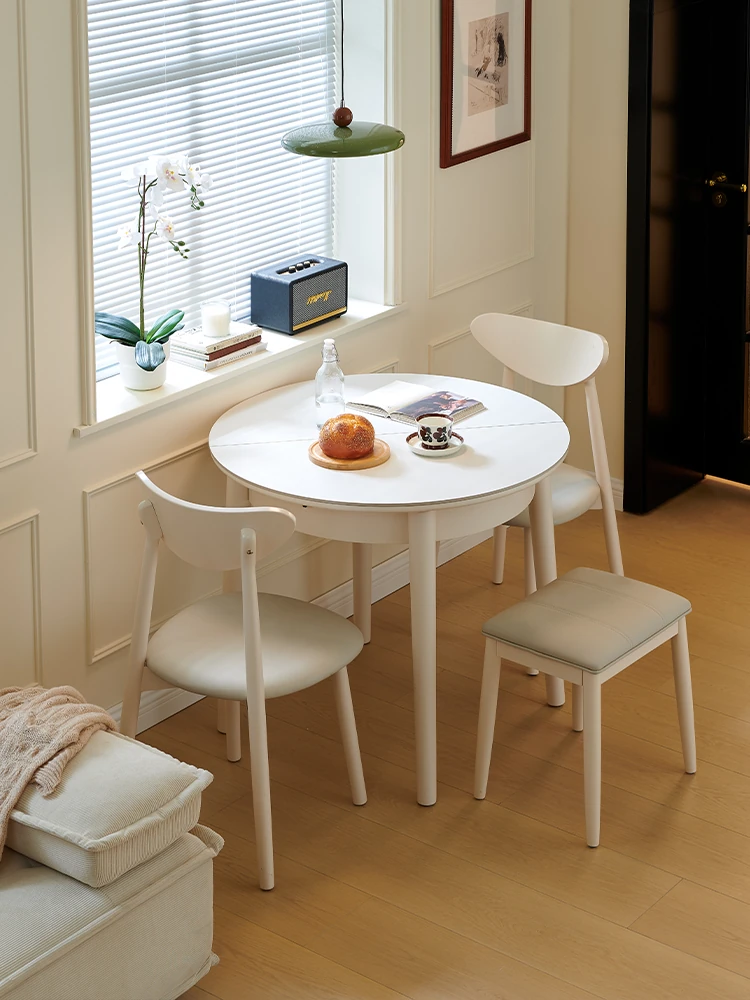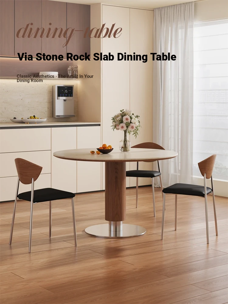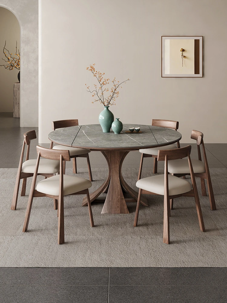 Wabi-Sabi Style Solid Wood Expandable Dining Table with Rock Slab - Versatile Round Italian Minimalist Dining Set for Living Room and Home Use