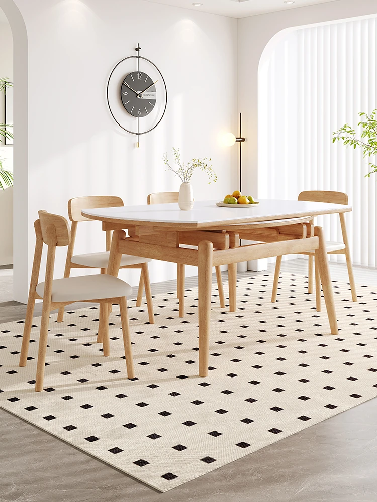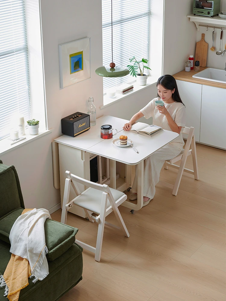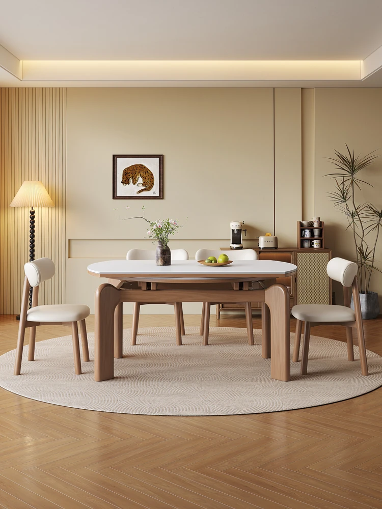 Creamy Wind Rock Panel Solid Wood Folding Dining Table - Expandable Space-Saving Table Set with Chairs for Small Homes, Stylish Rectangular Design, Perfect for Family Meals.