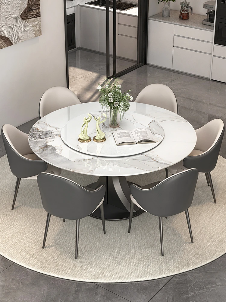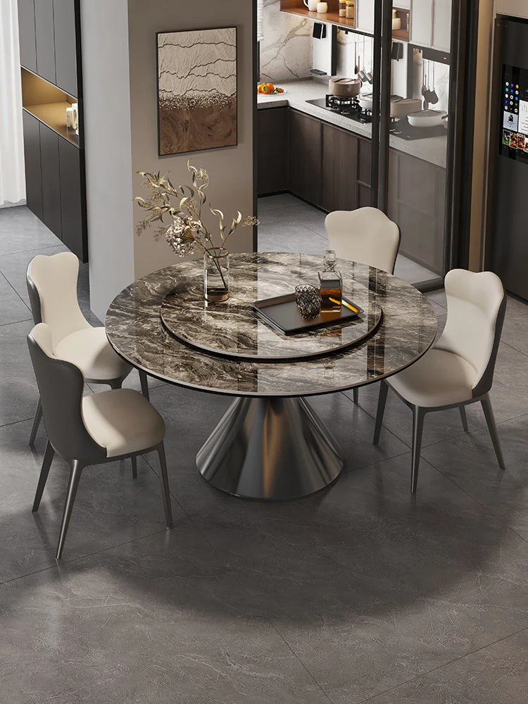Italian Luxury Home Dining Table - Nano Rock Round Table with Chanel-Inspired High-End Designer Chairs and Rotating Tray