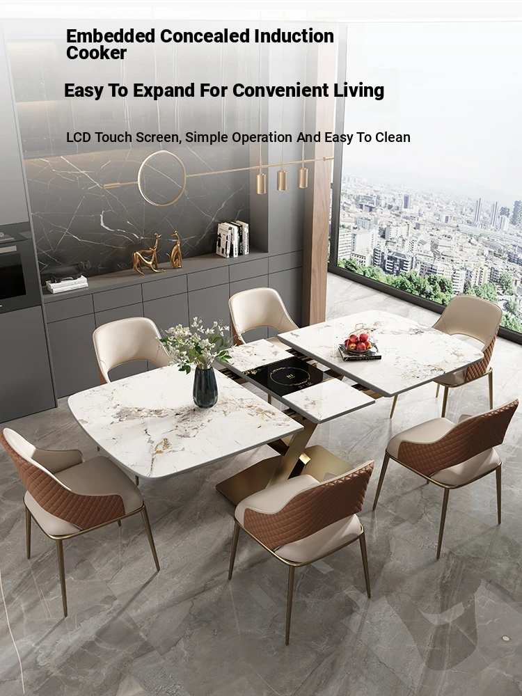 Modern Minimalist Expandable Dining Table for Small Spaces - Luxurious Rock Plate Design, Multi-functional with Built-in Induction Cooktop, Pandora Folding Dining Table for Home Use.
