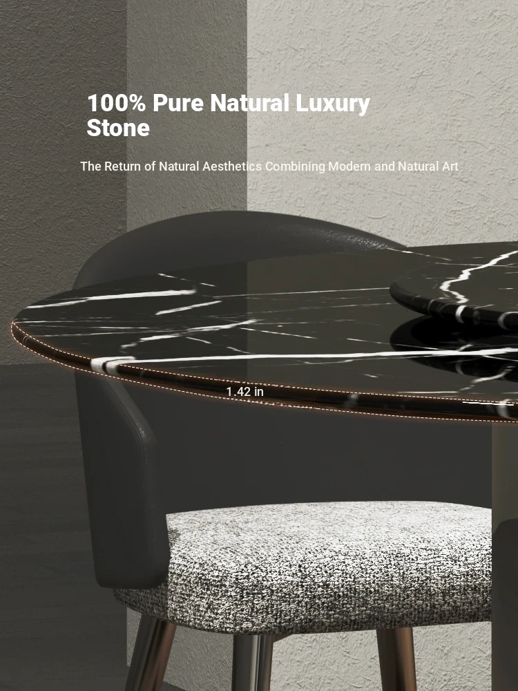 Natural black and white root luxury stone dining table + turntable + Classy leather dining chair * 4