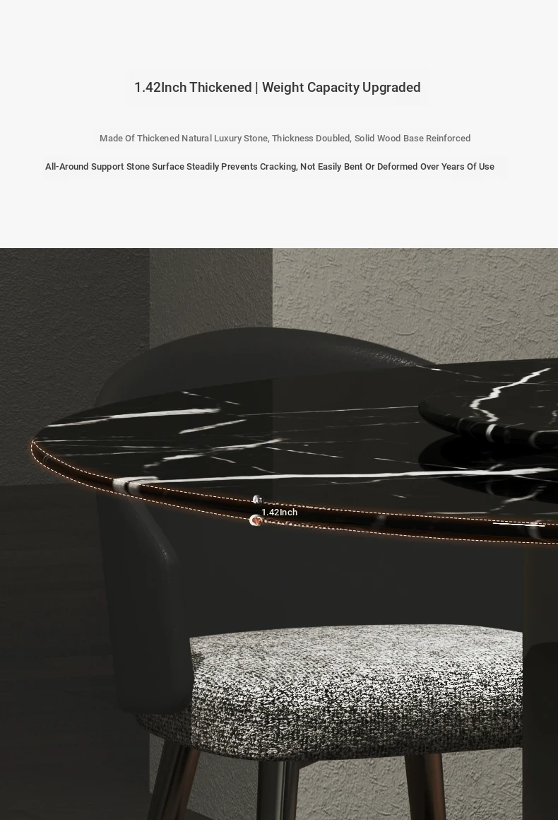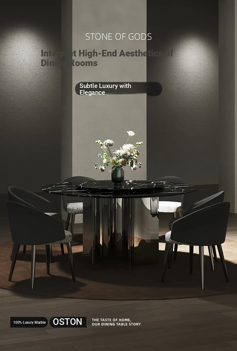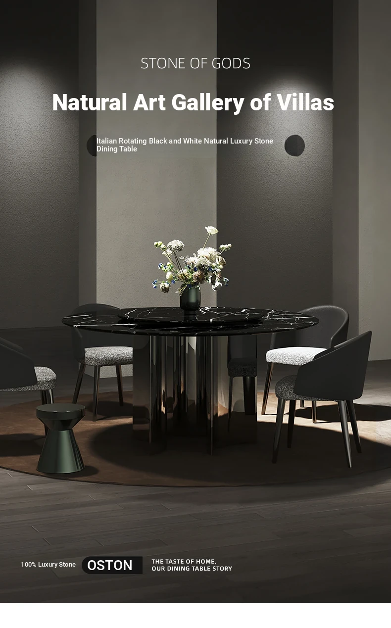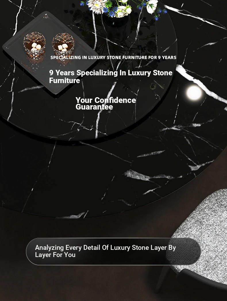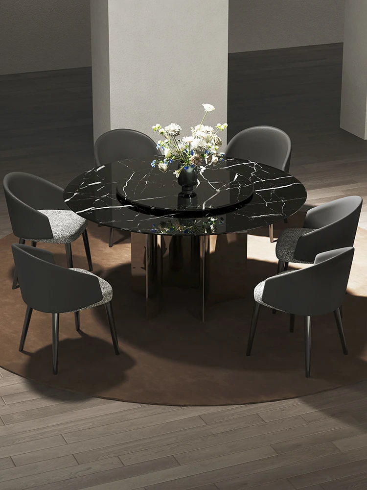 Natural black and white root luxury stone dining table + turntable + Classy leather dining chair * 6
