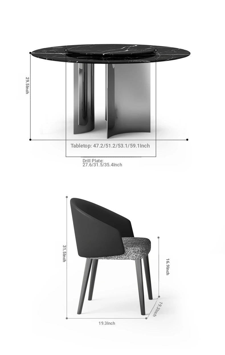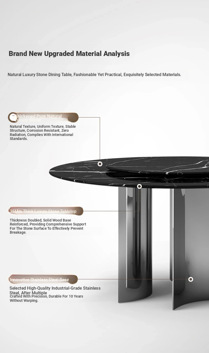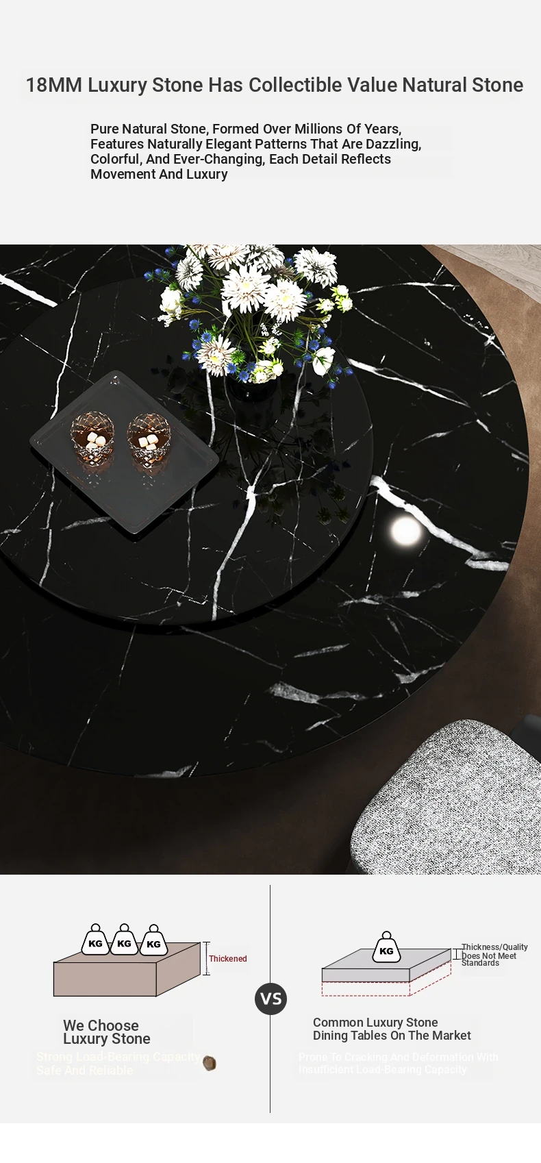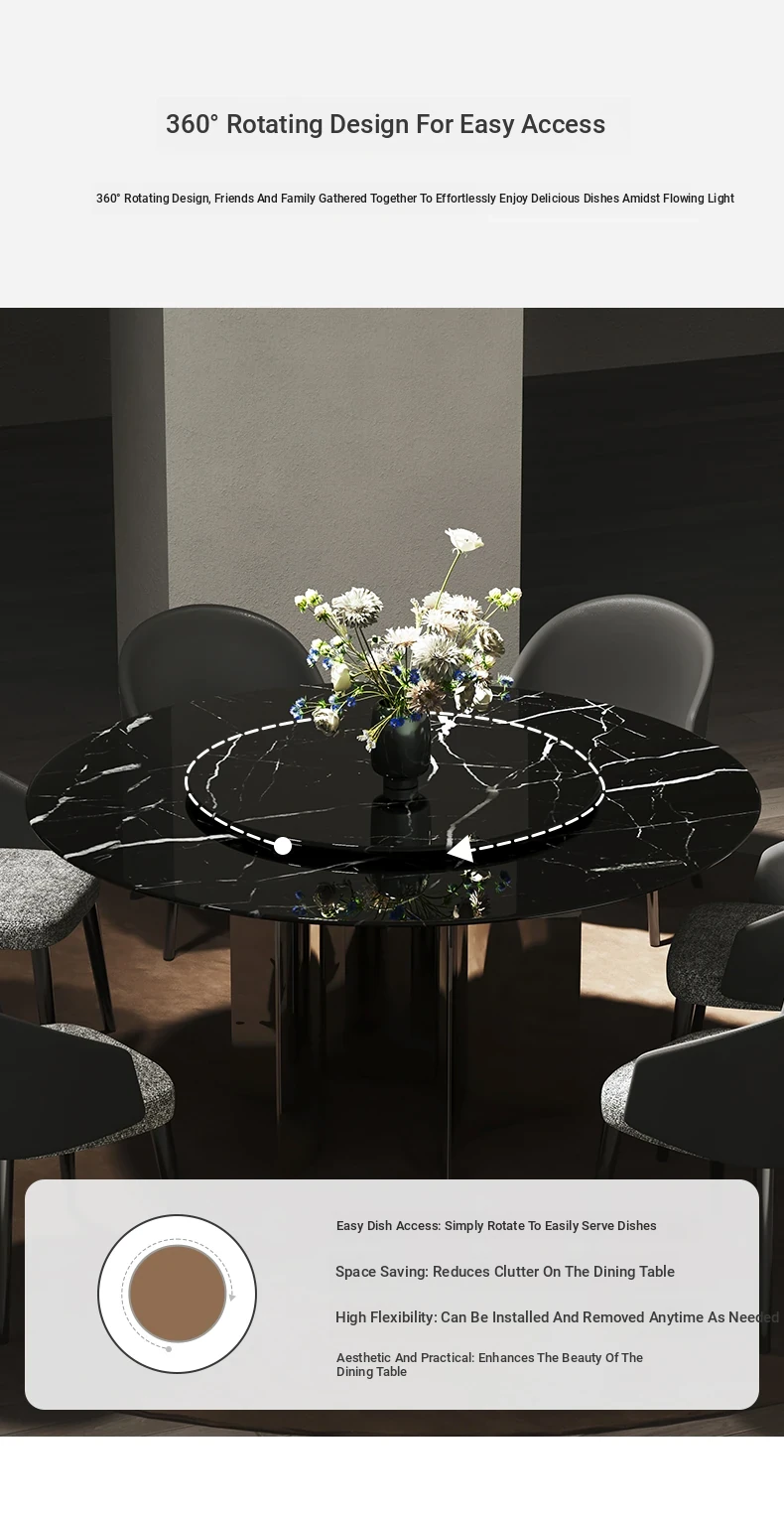 Natural black and white root luxury stone dining table + turntable + Classy leather dining chair * 6