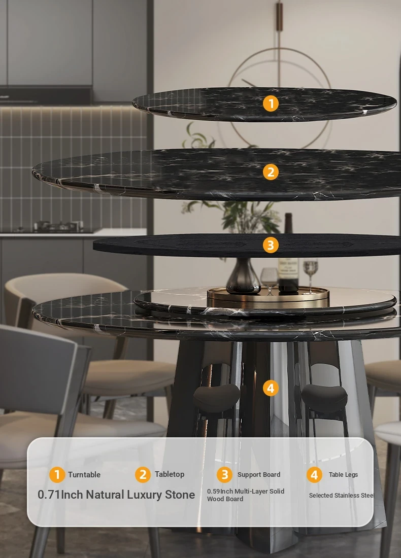 51.18in natural luxury stone Black Rose dining table +27.56in turntable + CC cat scratch leather dining chair * 4