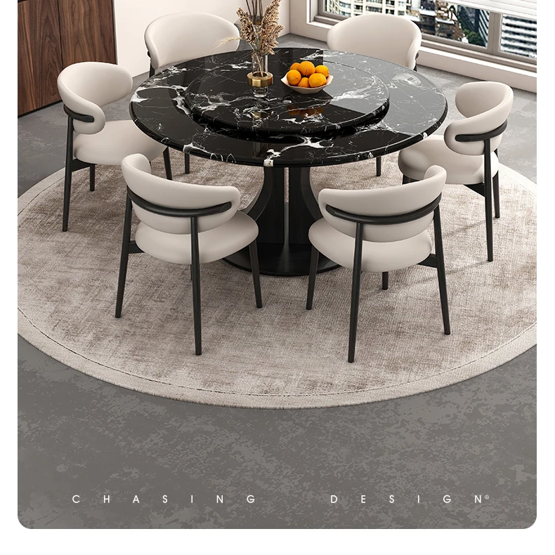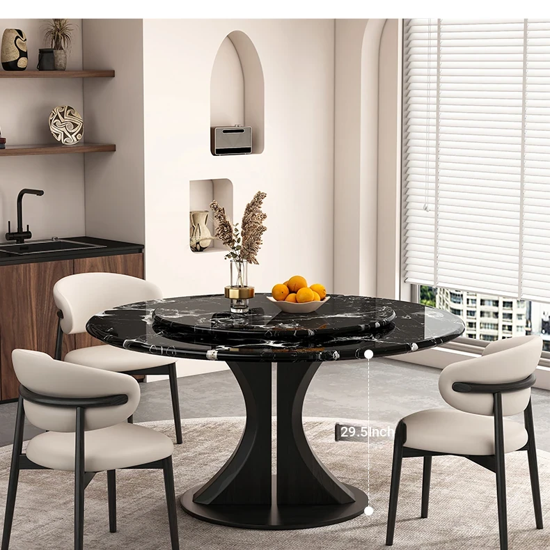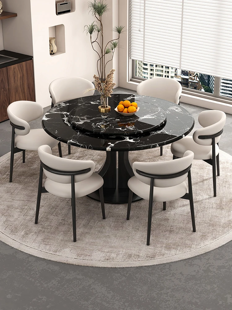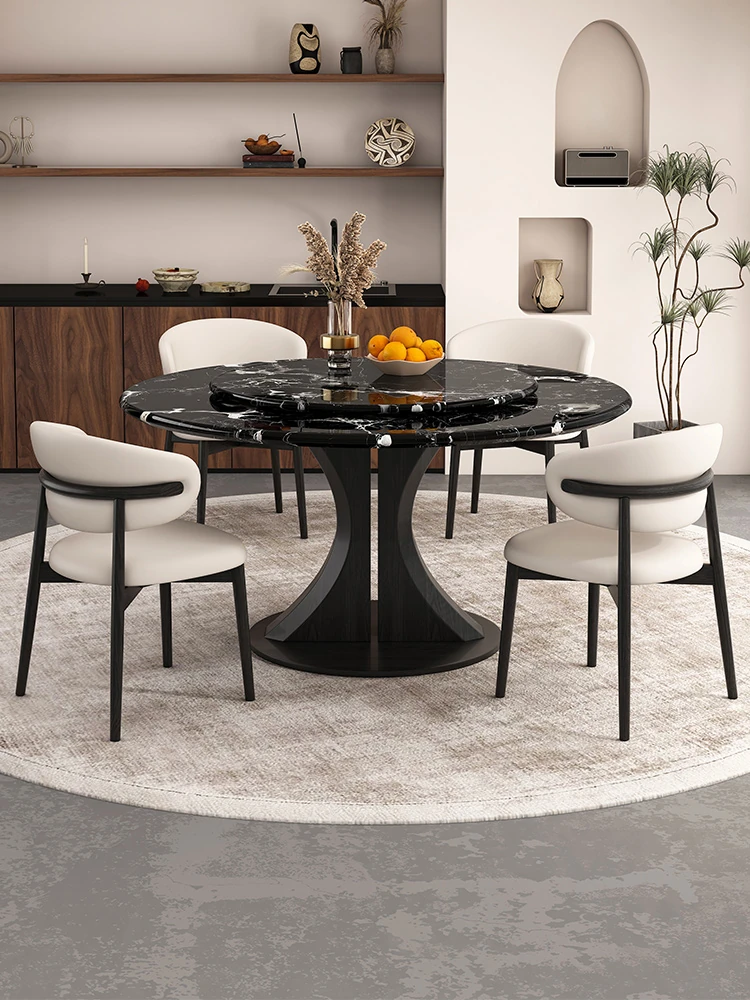 Luxurious Natural Stone French Vintage Style Imported Black Rose Round Dining Table - Elegant Home Villa High-End Dining Set with Chairs