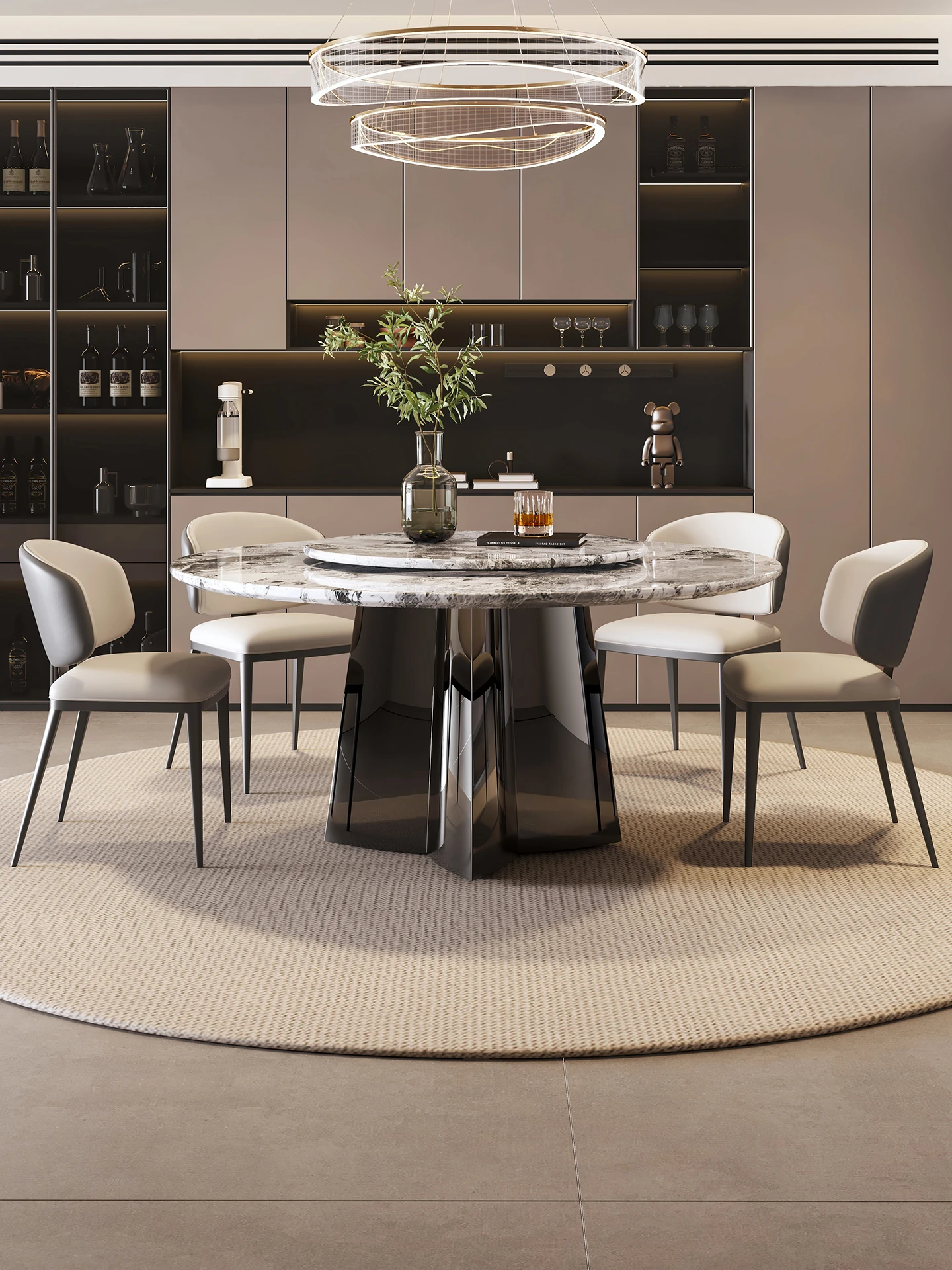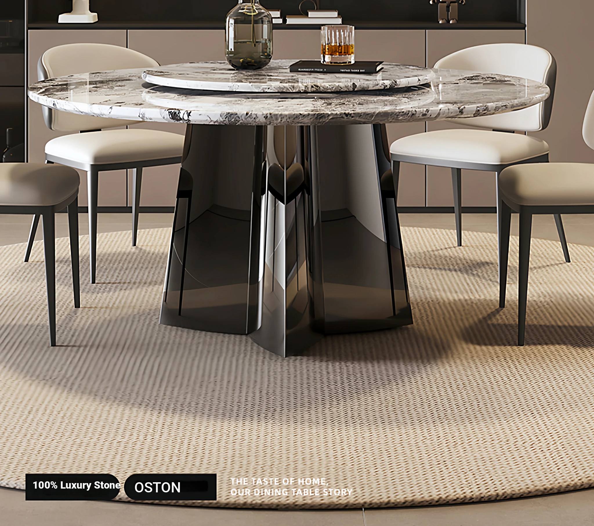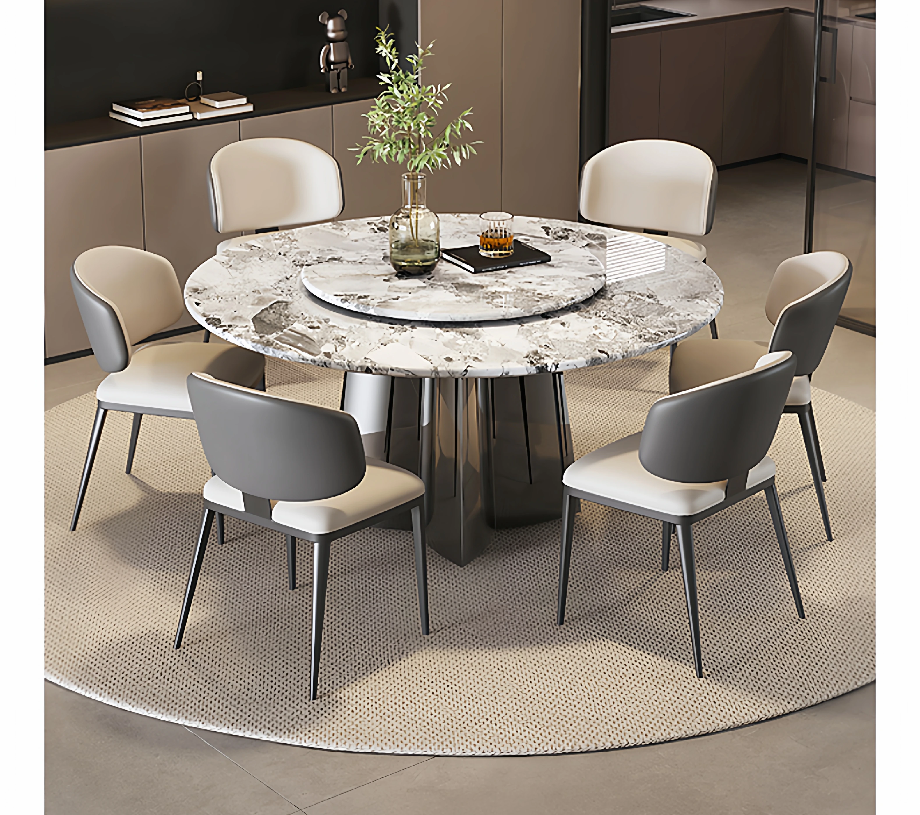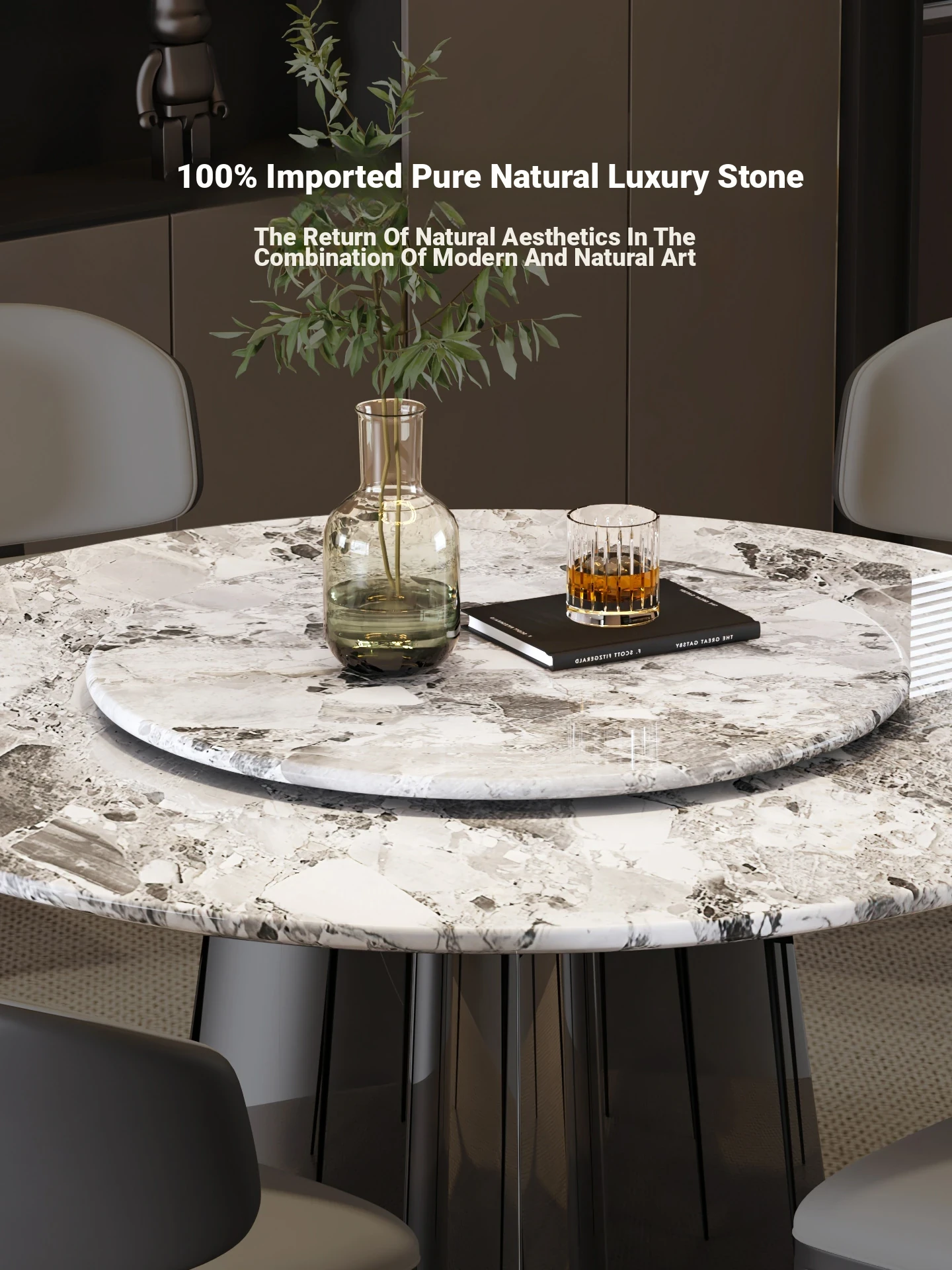 Premium Imported Natural Oreo Gray Marble Dining Table - Elegant Round Design Perfect for Upscale Dining Experiences, Complete with Stylish Chairs. Ideal for Modern Homes Seeking Luxury and Sophistication.