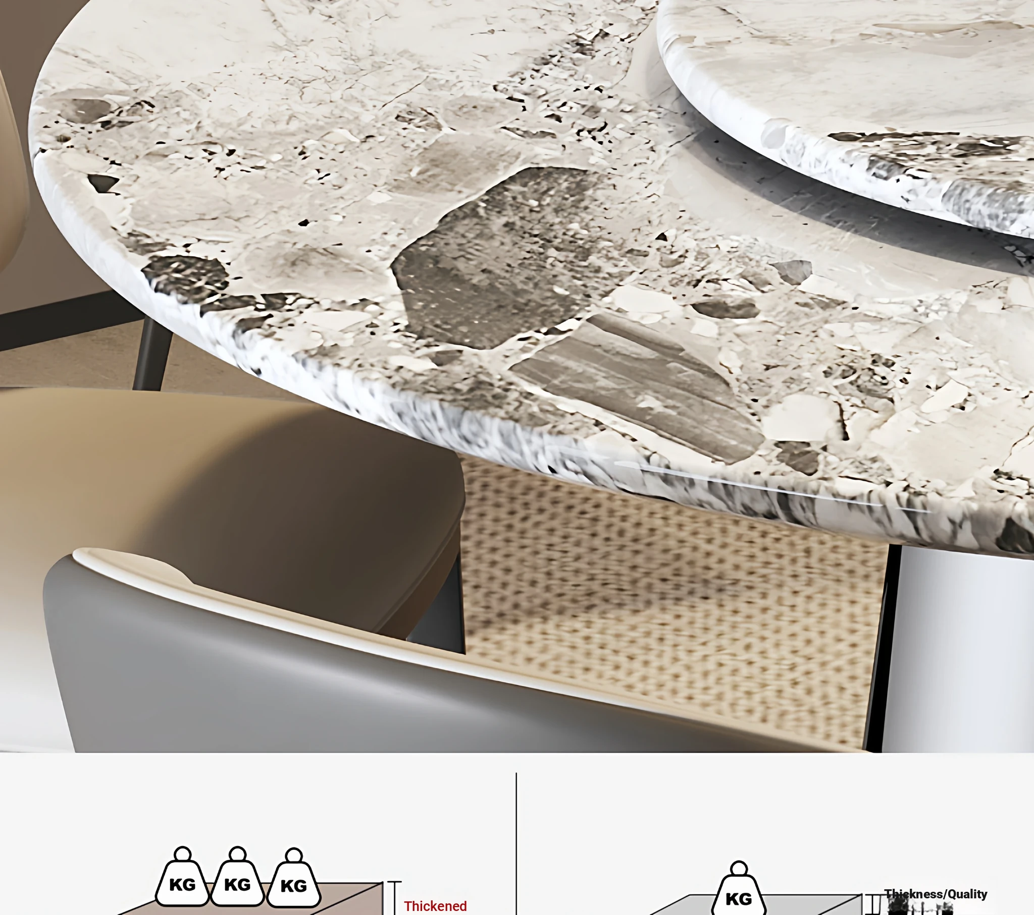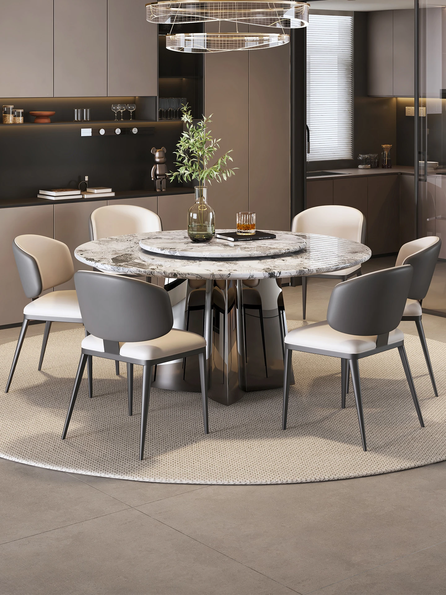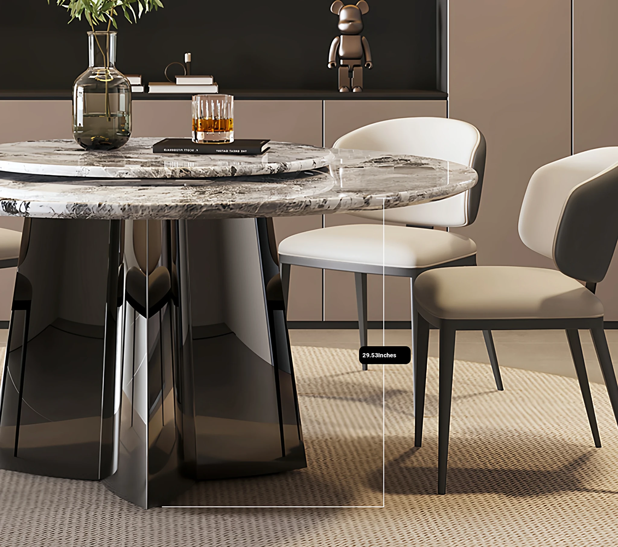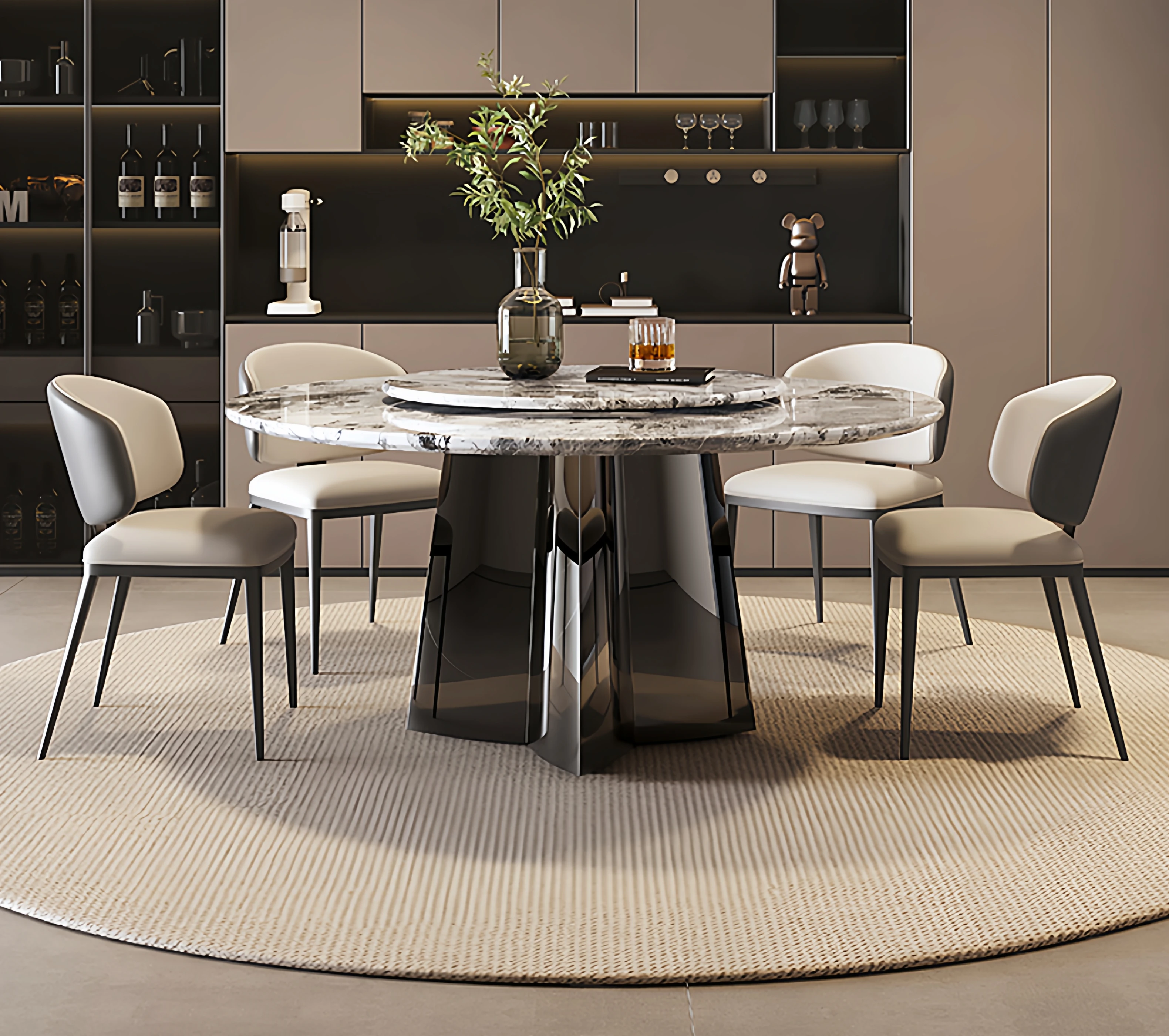 Premium Imported Natural Oreo Gray Marble Dining Table - Elegant Round Design Perfect for Upscale Dining Experiences, Complete with Stylish Chairs. Ideal for Modern Homes Seeking Luxury and Sophistication.