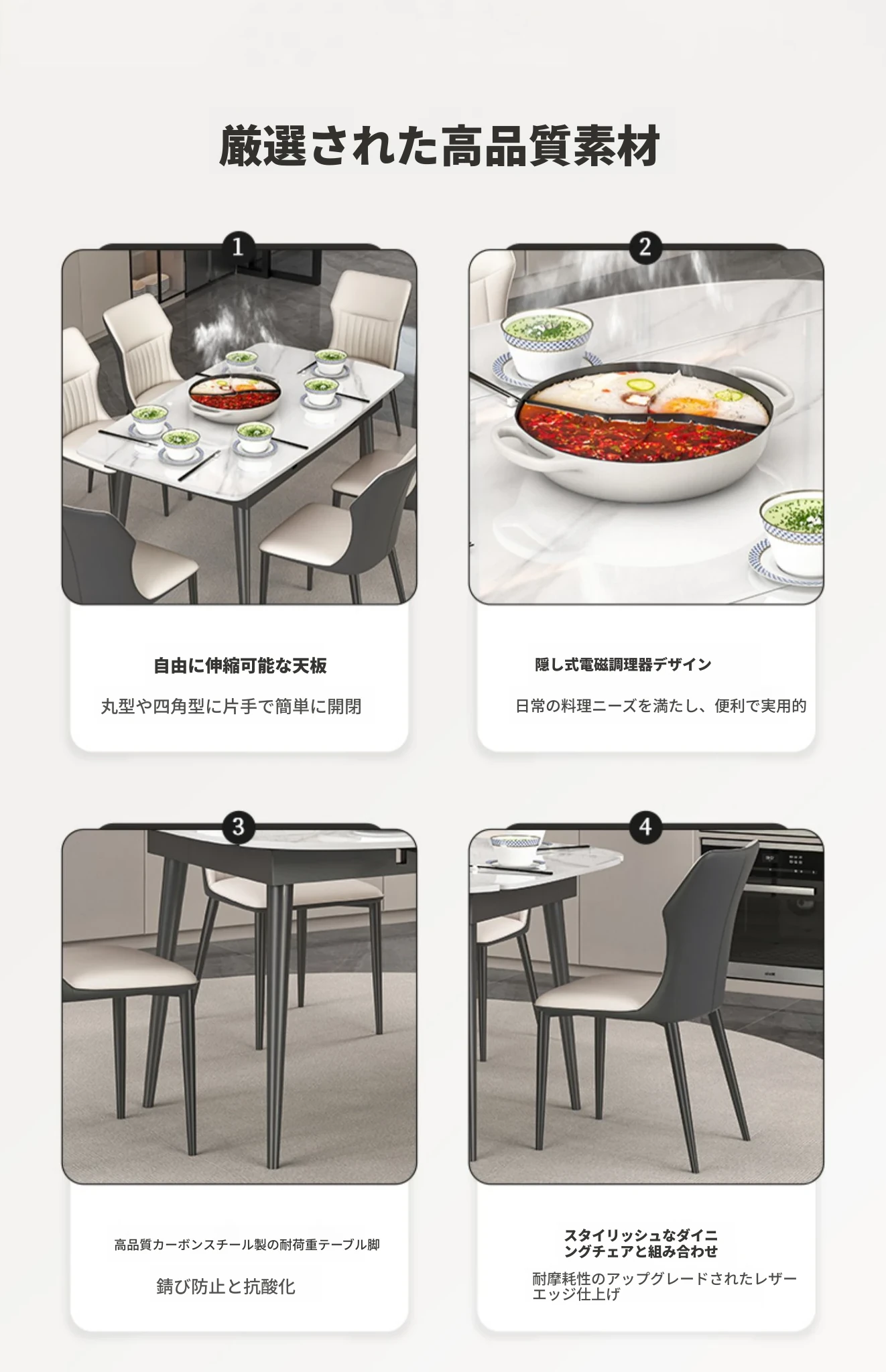 1.3Mダイニングテーブル 伸縮式 電磁調理器付き + キャットスクラッチレザー椅子*4
