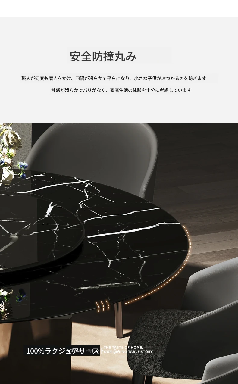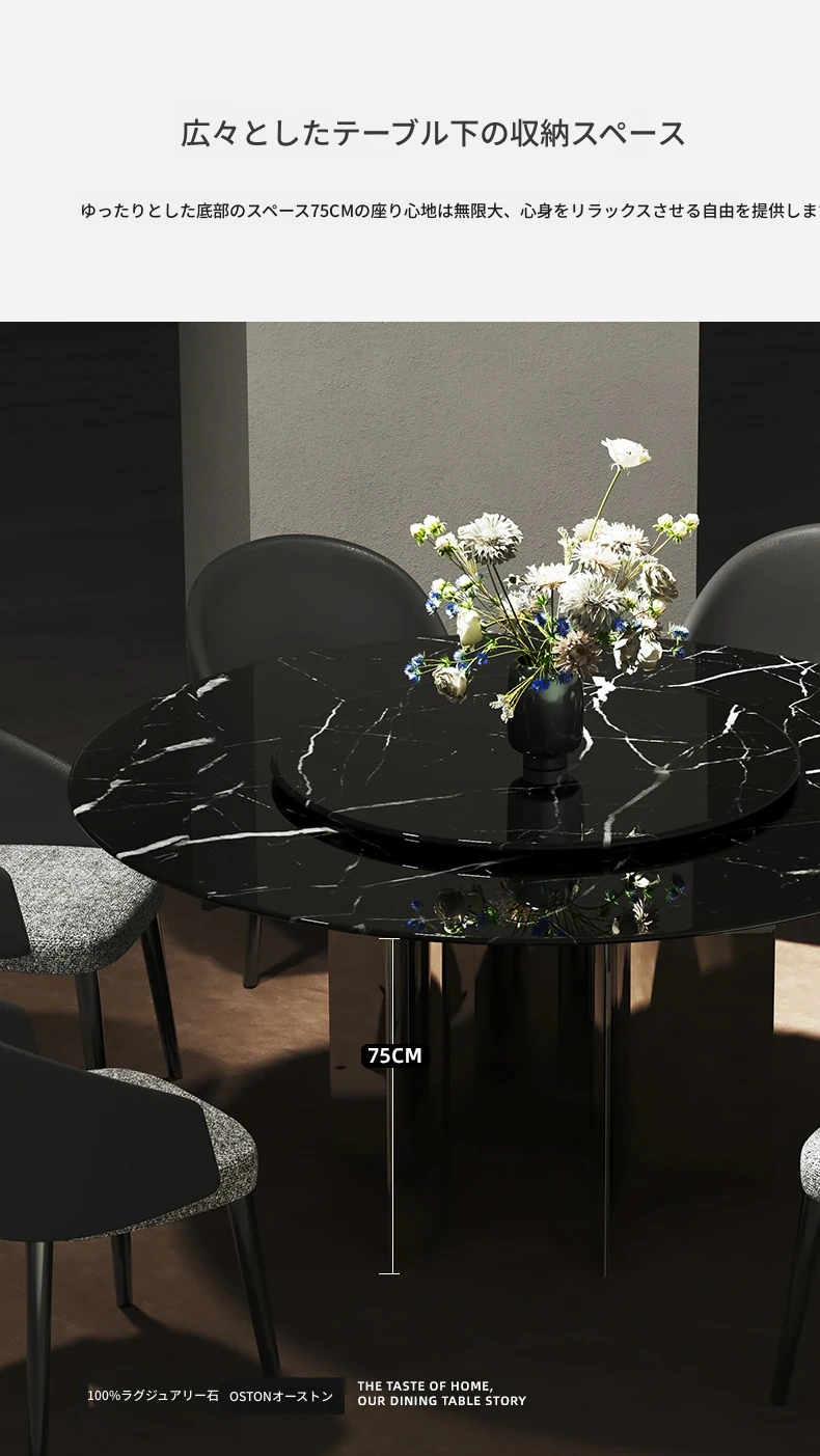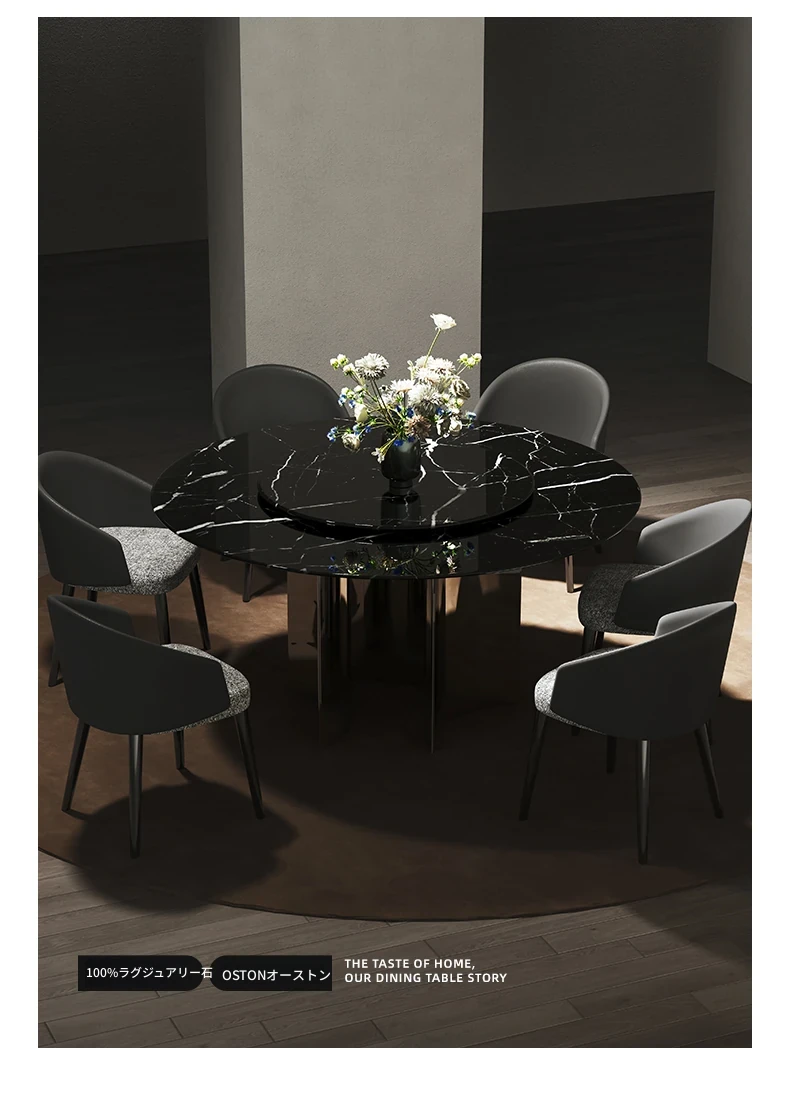 天然のブラックホワイトルート高級石製ダイニングテーブル+回転盤+高級レザー布製ダイニングチェア*6