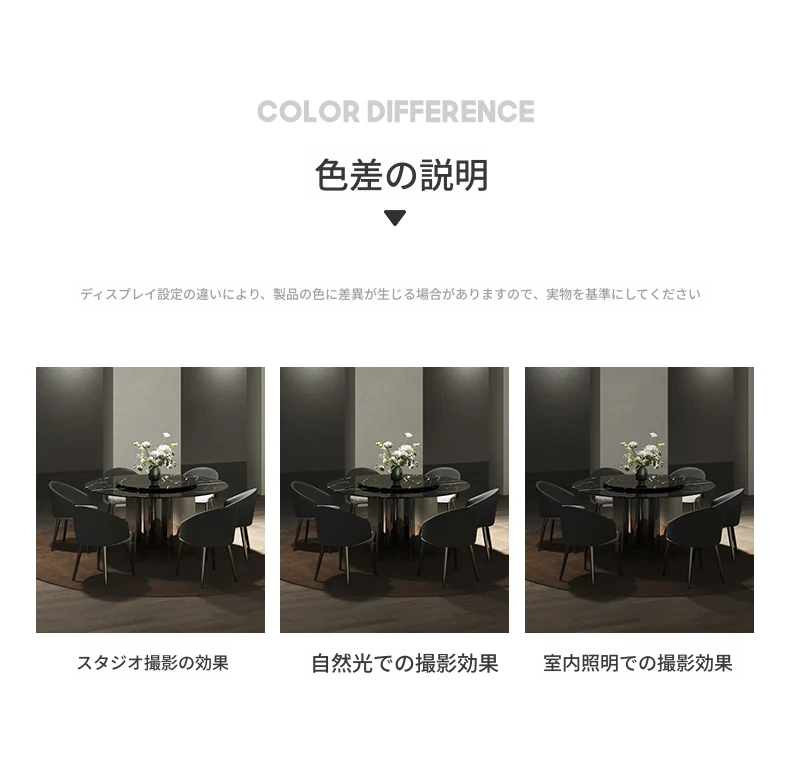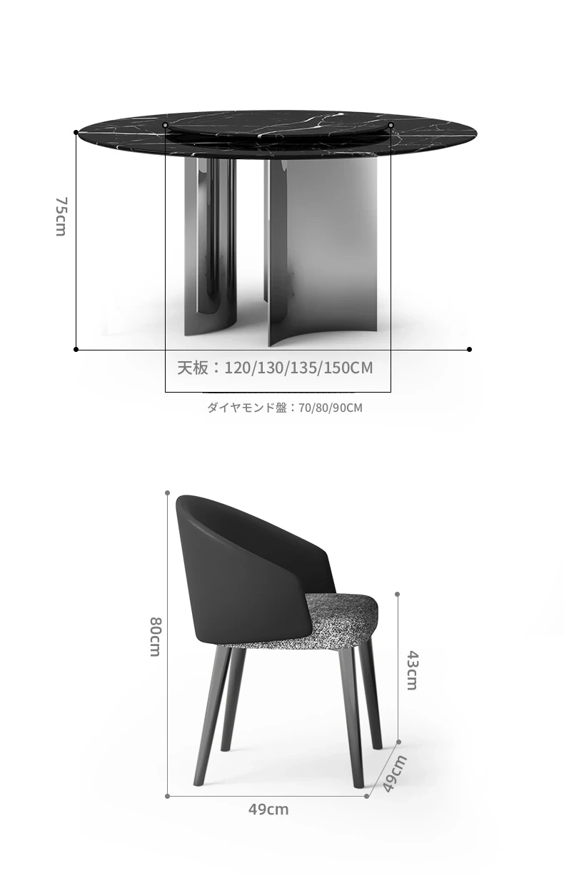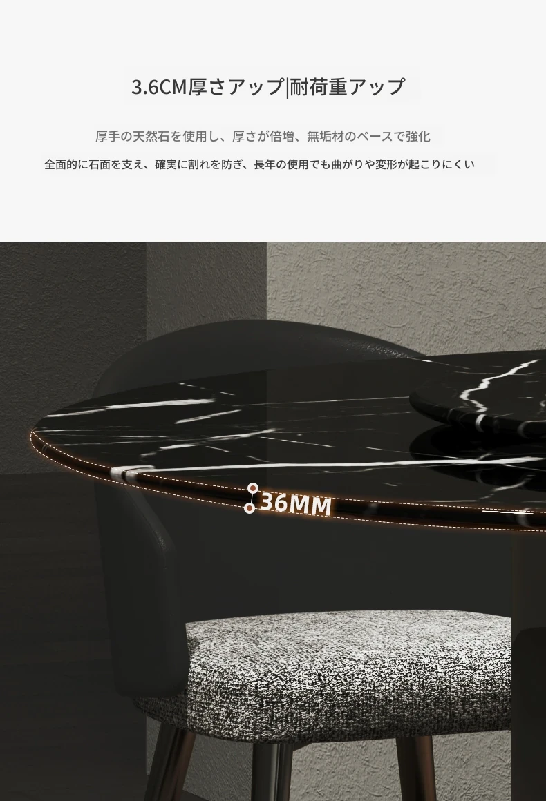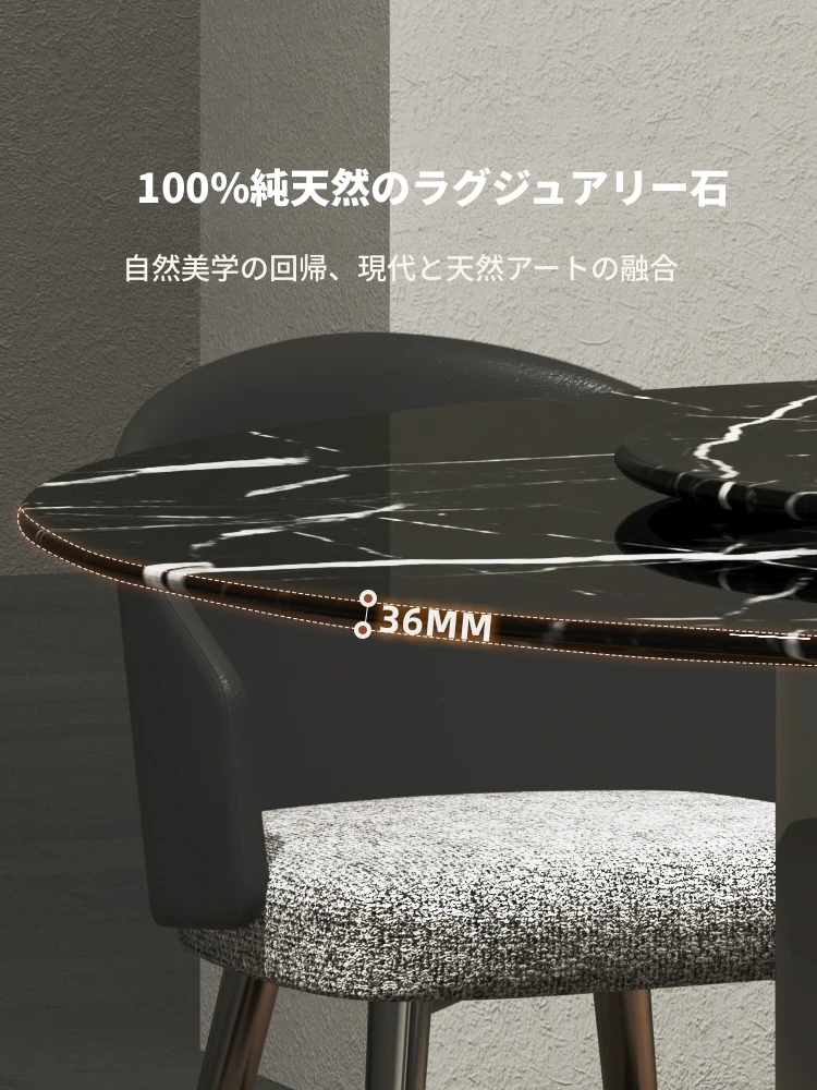 天然のブラックホワイトルート高級石製ダイニングテーブル+回転盤+高級レザー布製ダイニングチェア*6