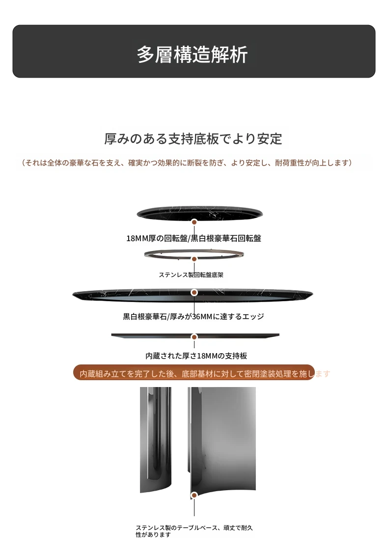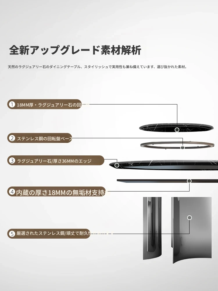 天然のブラックホワイトルート高級石製ダイニングテーブル+回転盤+高級レザー布製ダイニングチェア*4