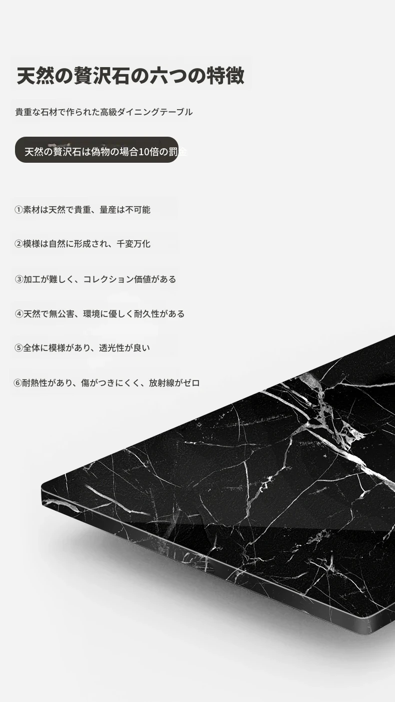 天然のブラックホワイトルート高級石製ダイニングテーブル+高級レザー布製ダイニングチェア*6