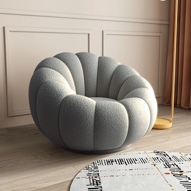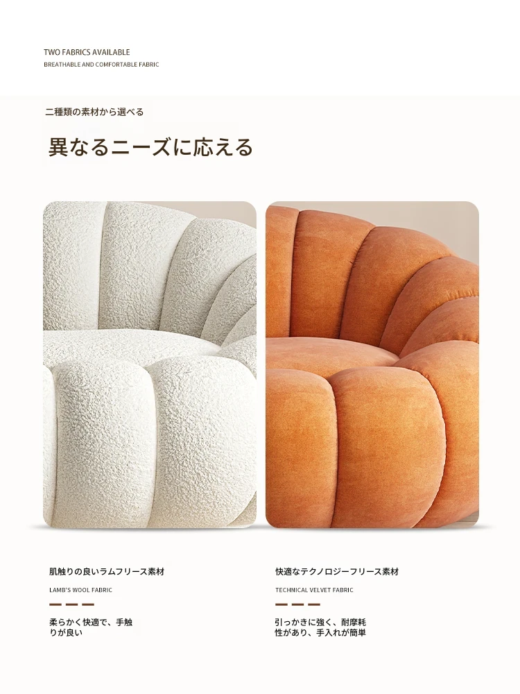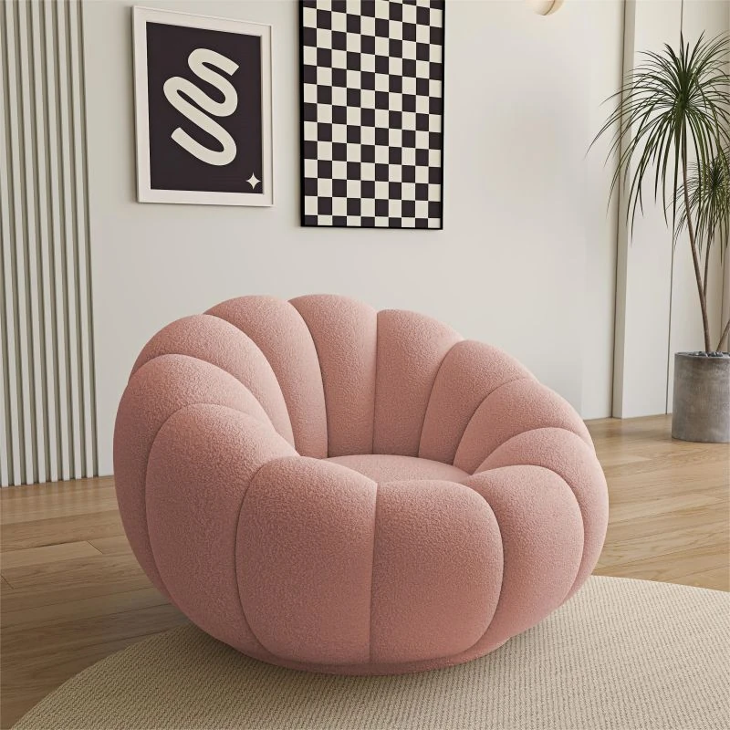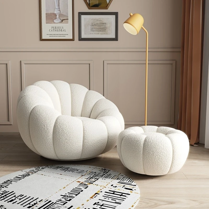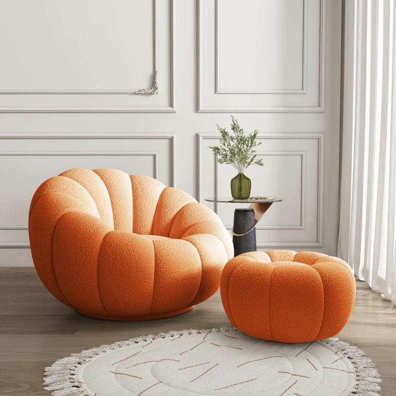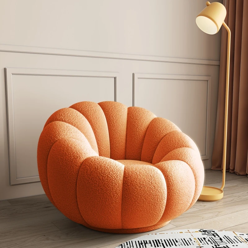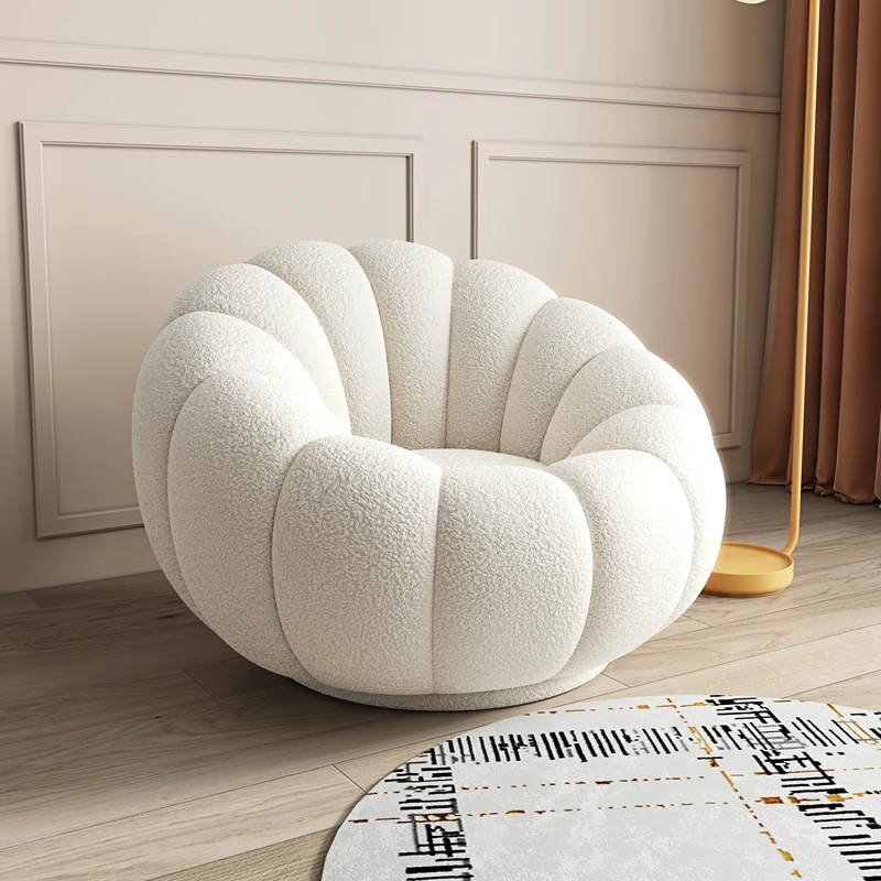 リビング用カボチャ型ラウンジソファ!南国風のクリーミーなラムファー製、バルコニーでくつろぐための回転式一人用チェア。心地よいリラックス空間を演出し、あなたの毎日を特別にします!