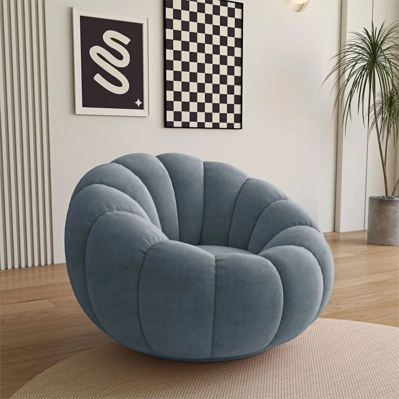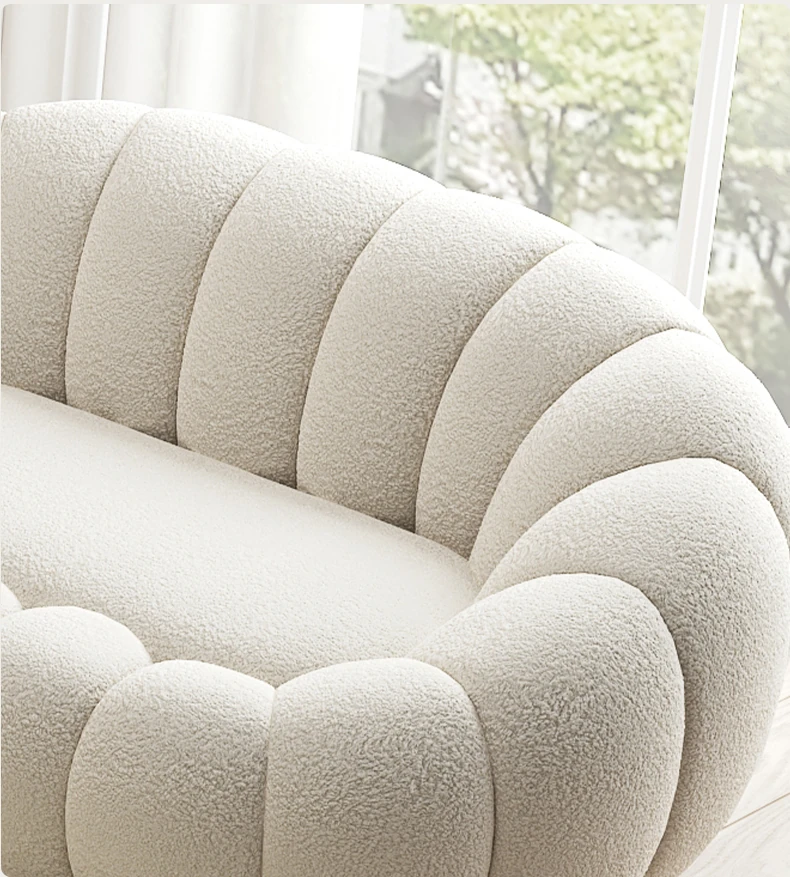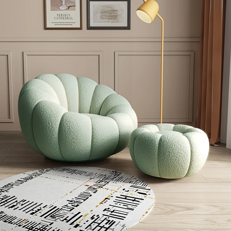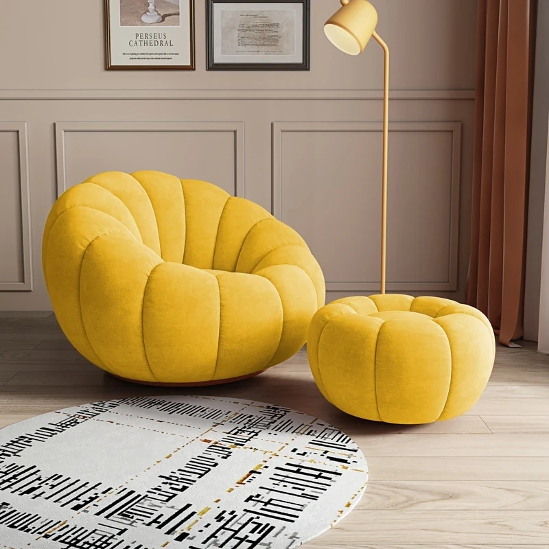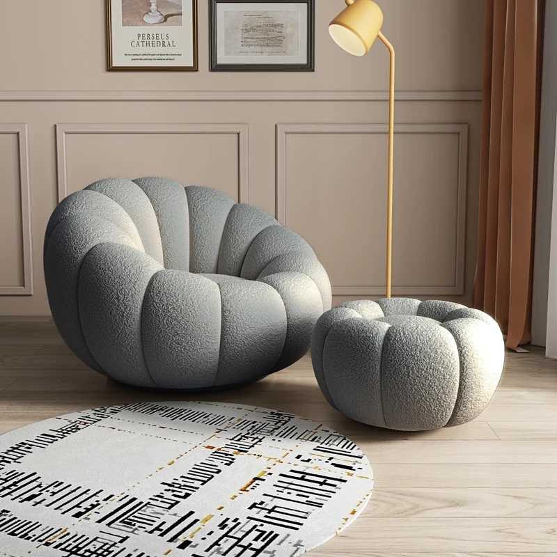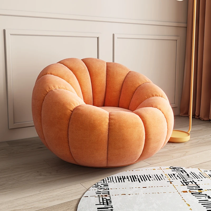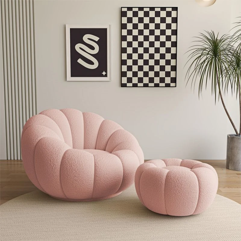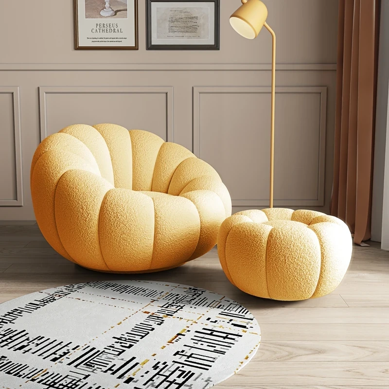 リビング用カボチャ型ラウンジソファ!南国風のクリーミーなラムファー製、バルコニーでくつろぐための回転式一人用チェア。心地よいリラックス空間を演出し、あなたの毎日を特別にします!