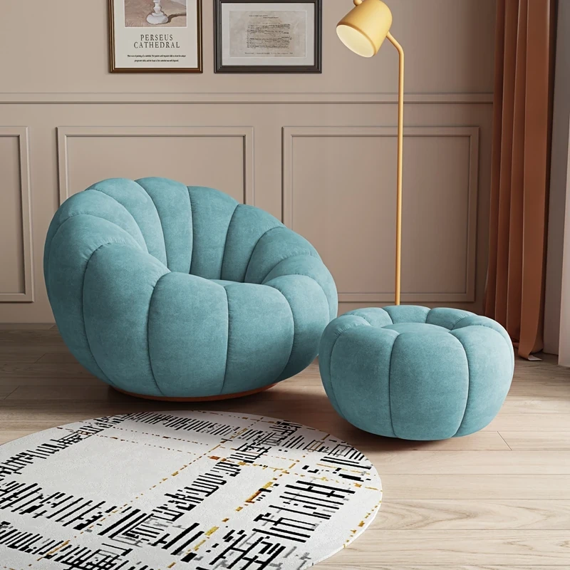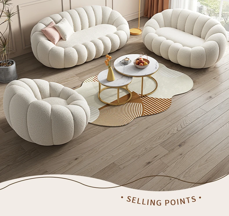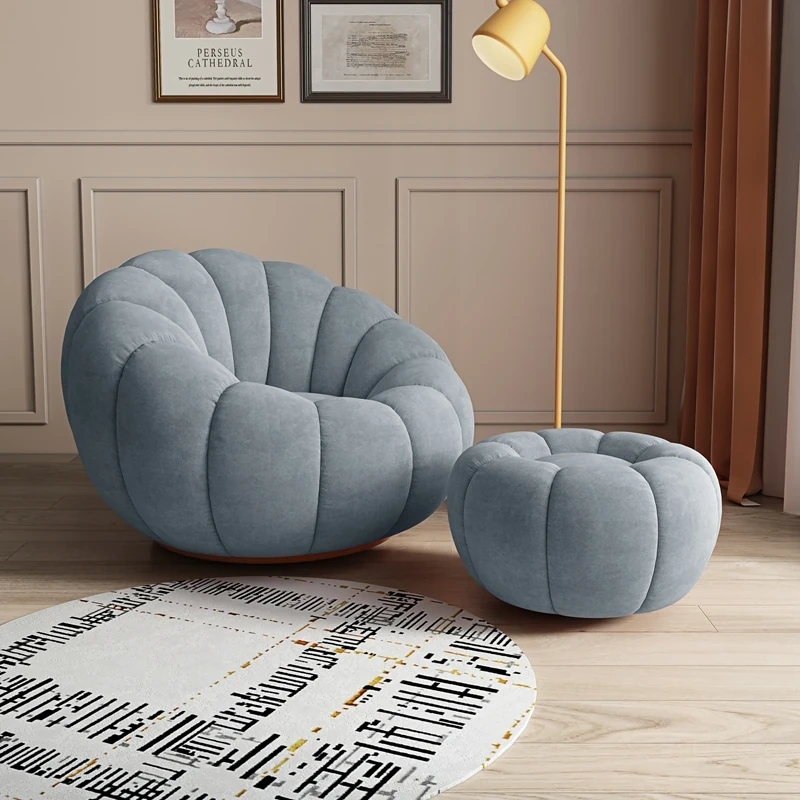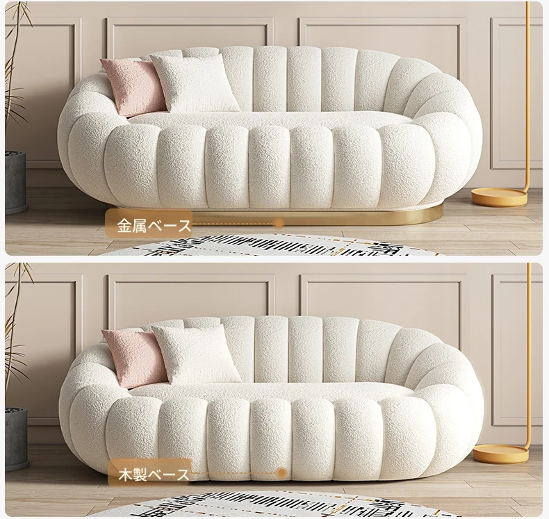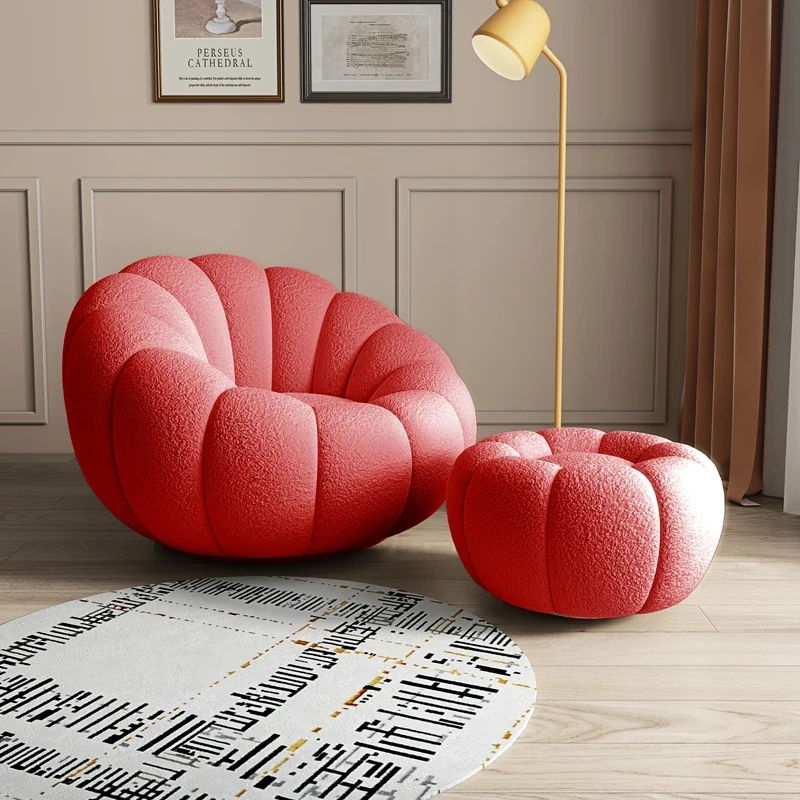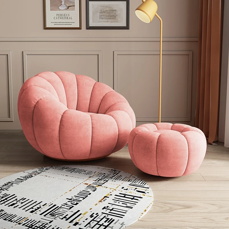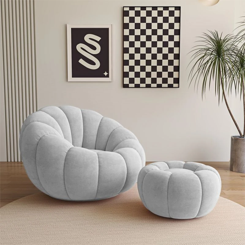 リビング用カボチャ型ラウンジソファ!南国風のクリーミーなラムファー製、バルコニーでくつろぐための回転式一人用チェア。心地よいリラックス空間を演出し、あなたの毎日を特別にします!