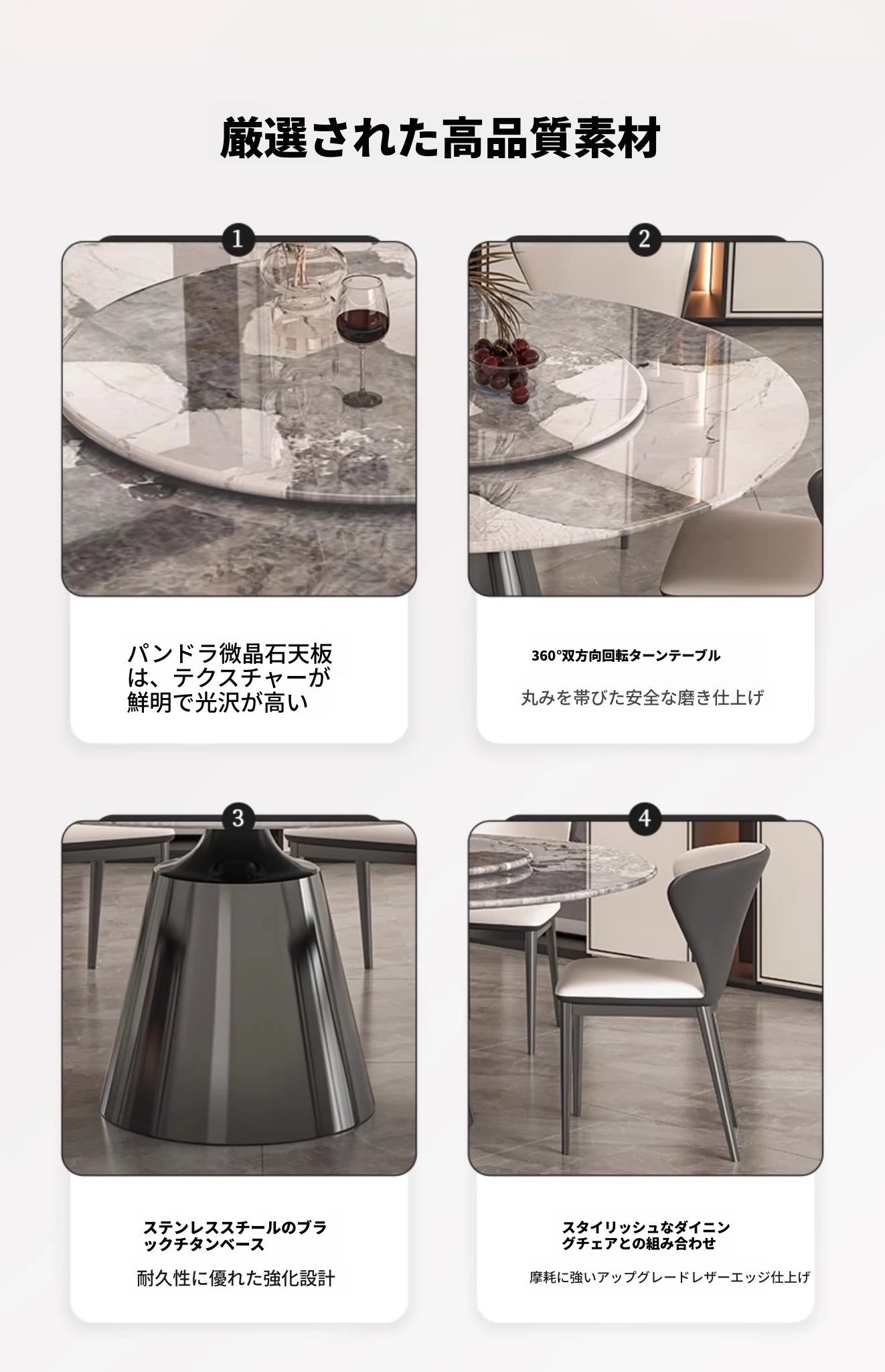1.5M天然微晶石ダイニングテーブル【回転托】+猫爪皮製ダイニングチェア4脚