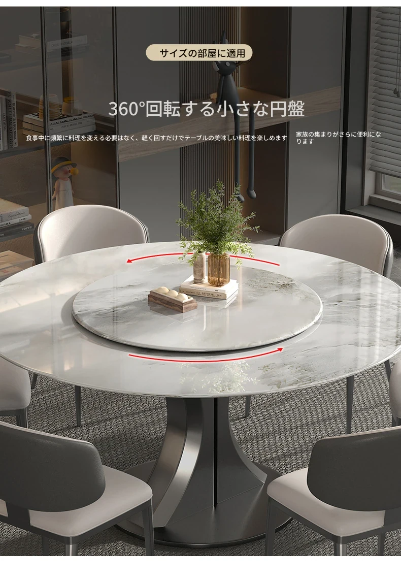 1.35M天然大理石ダイニングテーブル(回転盤付き)+猫の爪研ぎ皮製ダイニングチェア*6