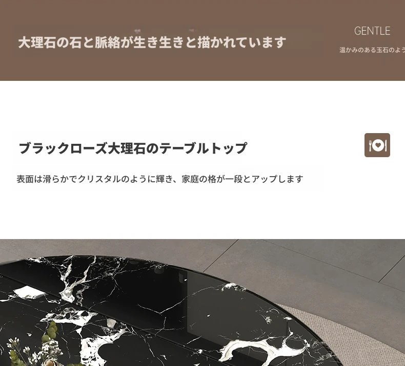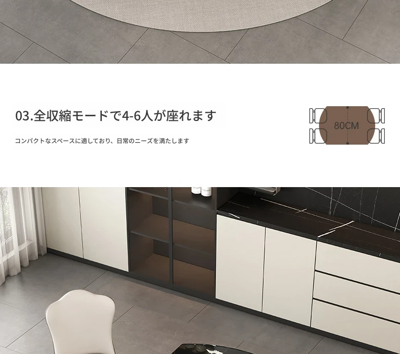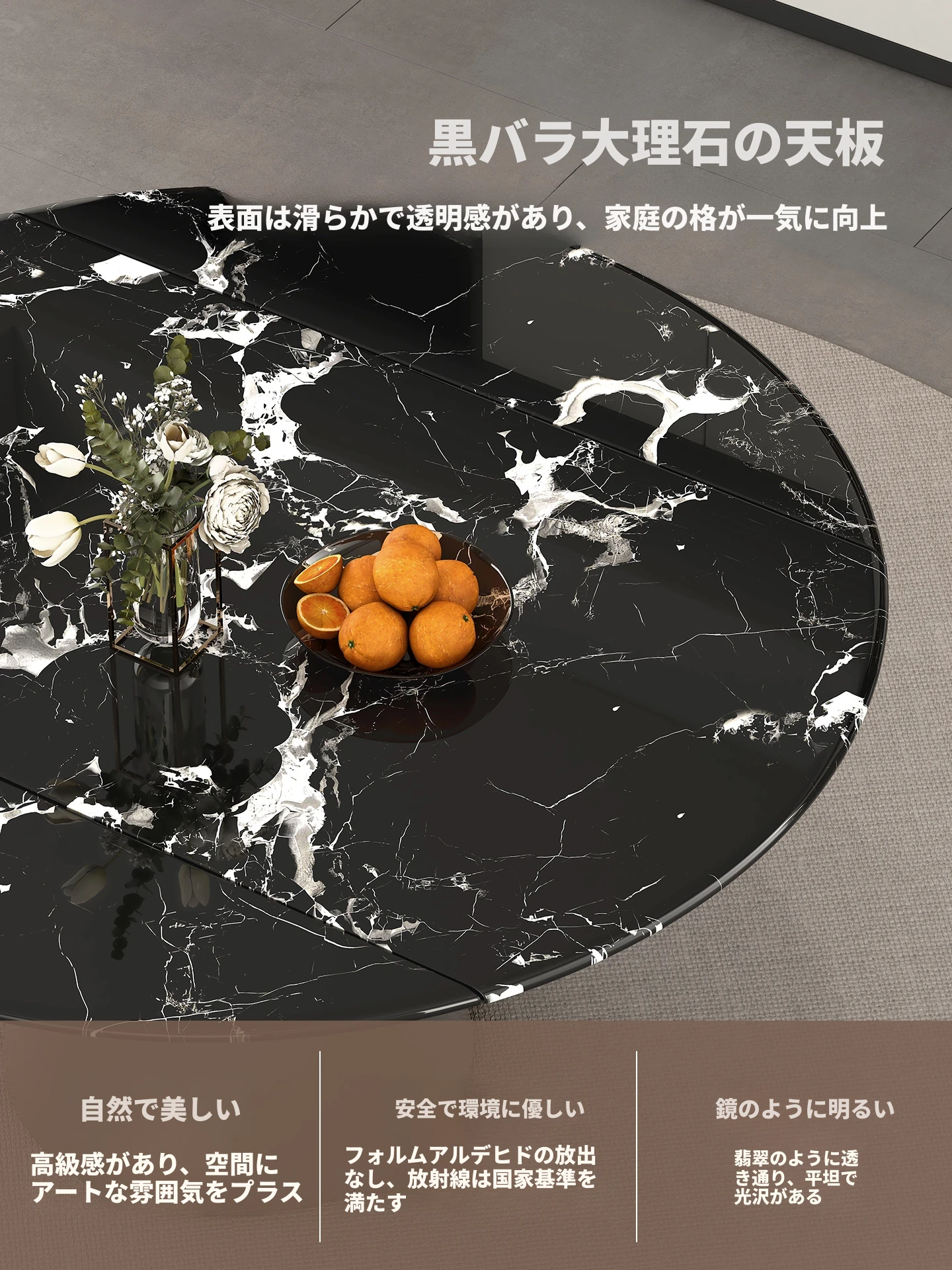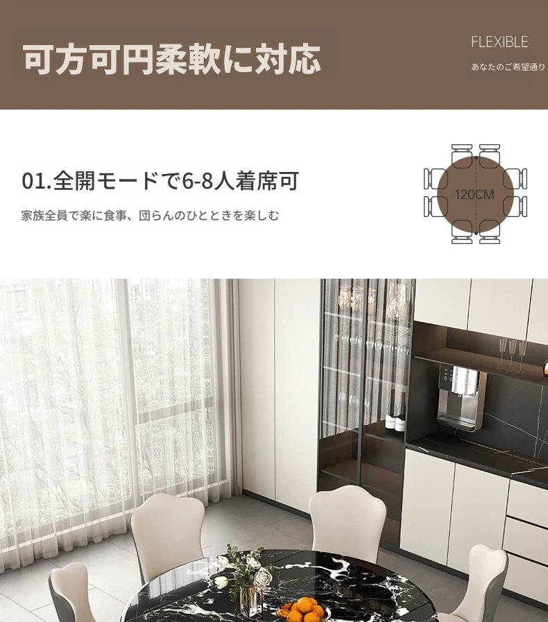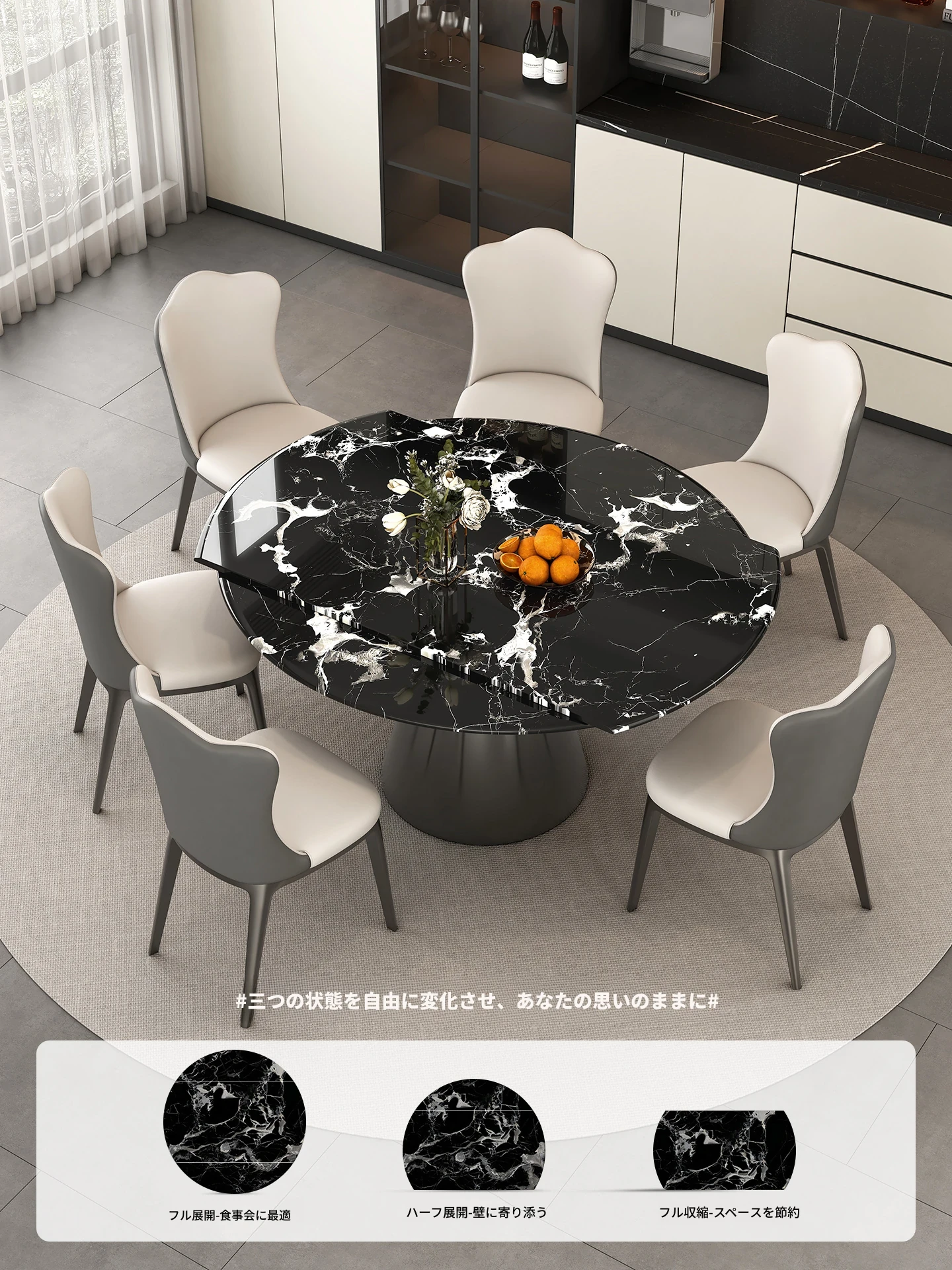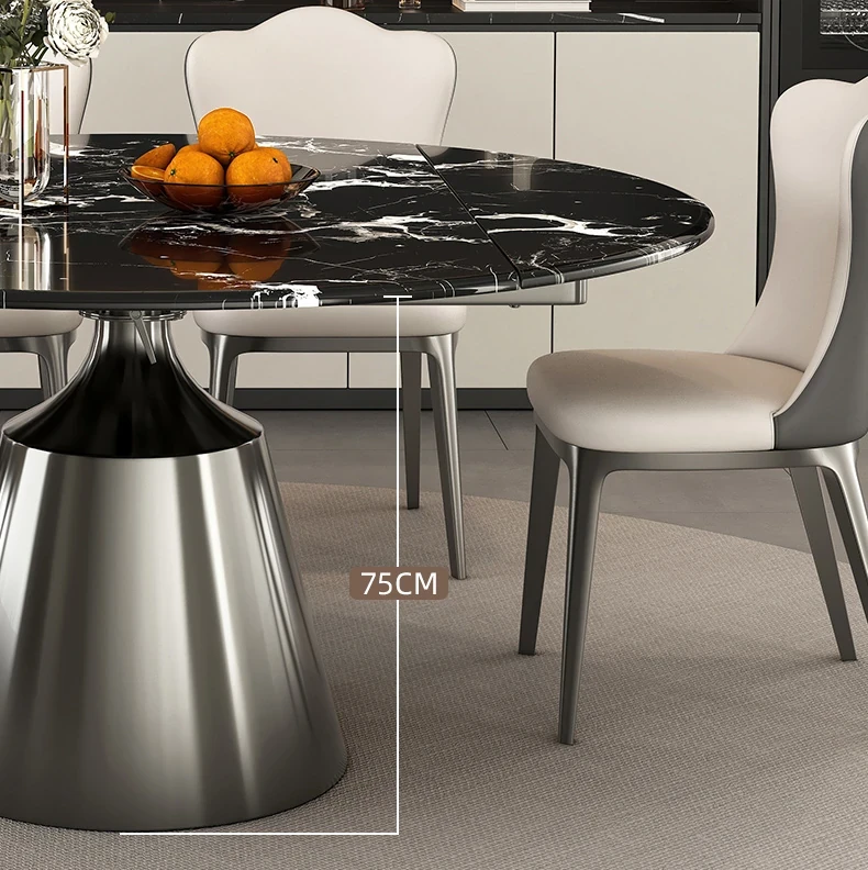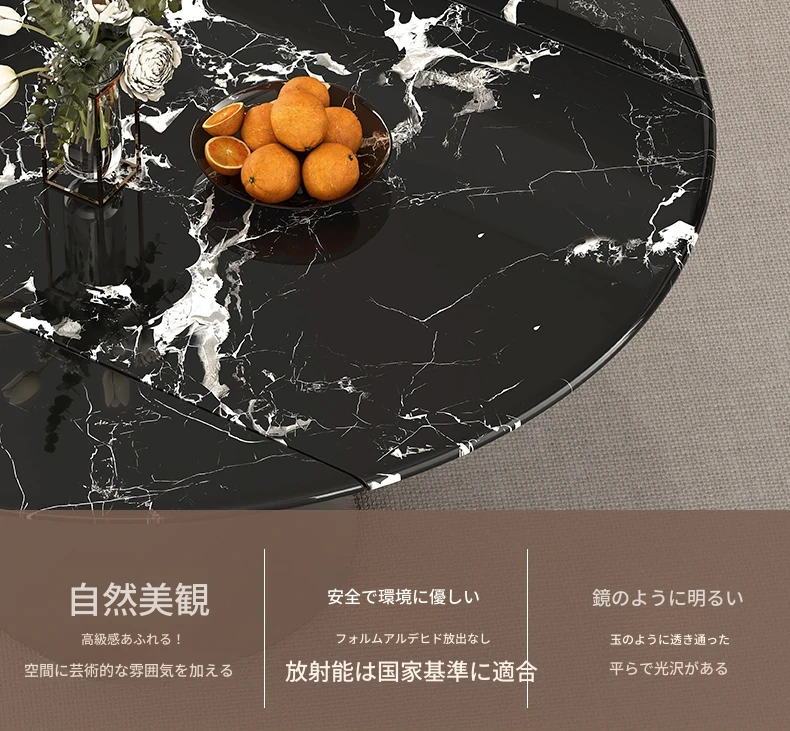 天然ブラックローズ大理石の伸縮式ダイニングテーブル - 高級イタリアンデザイン、小スペースにも最適な回転式の円形・四角形兼用テーブルで、食事がもっと楽しくなる!