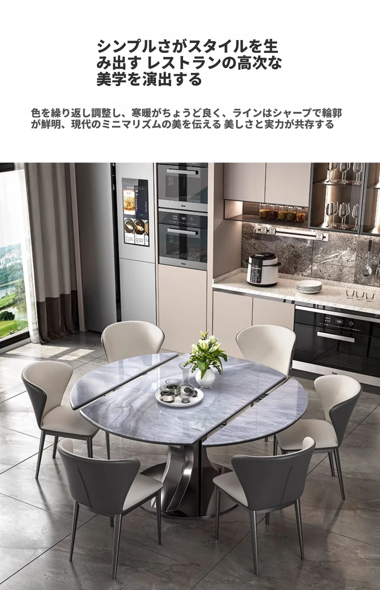 1.3M天然微晶石伸縮ダイニングテーブル+猫爪皮製ダイニングチェア*4