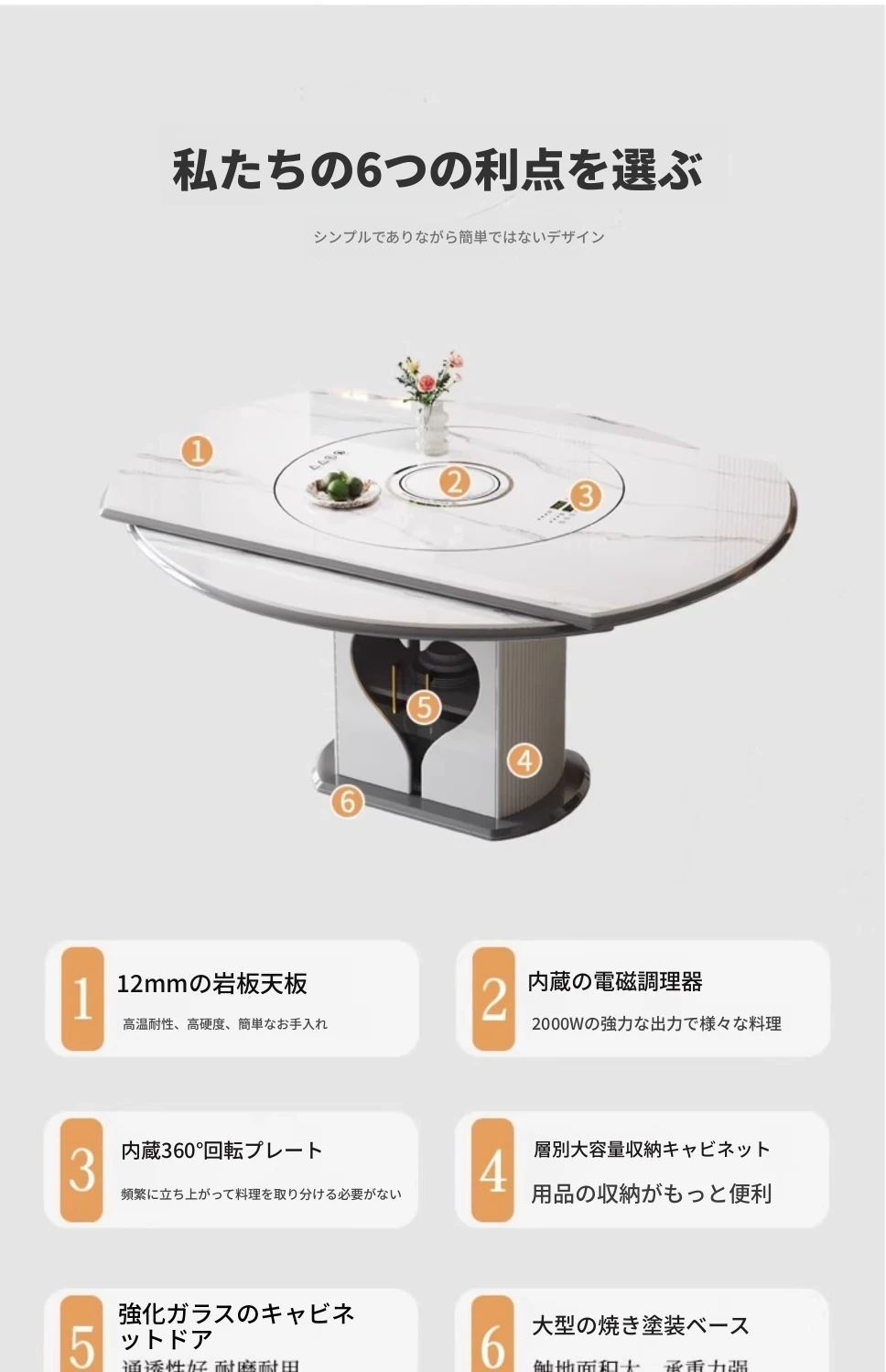 1.5メートル佛山ダイニングテーブル+6椅子【AI音声制御温菜板】+自動回転台+電磁調理器