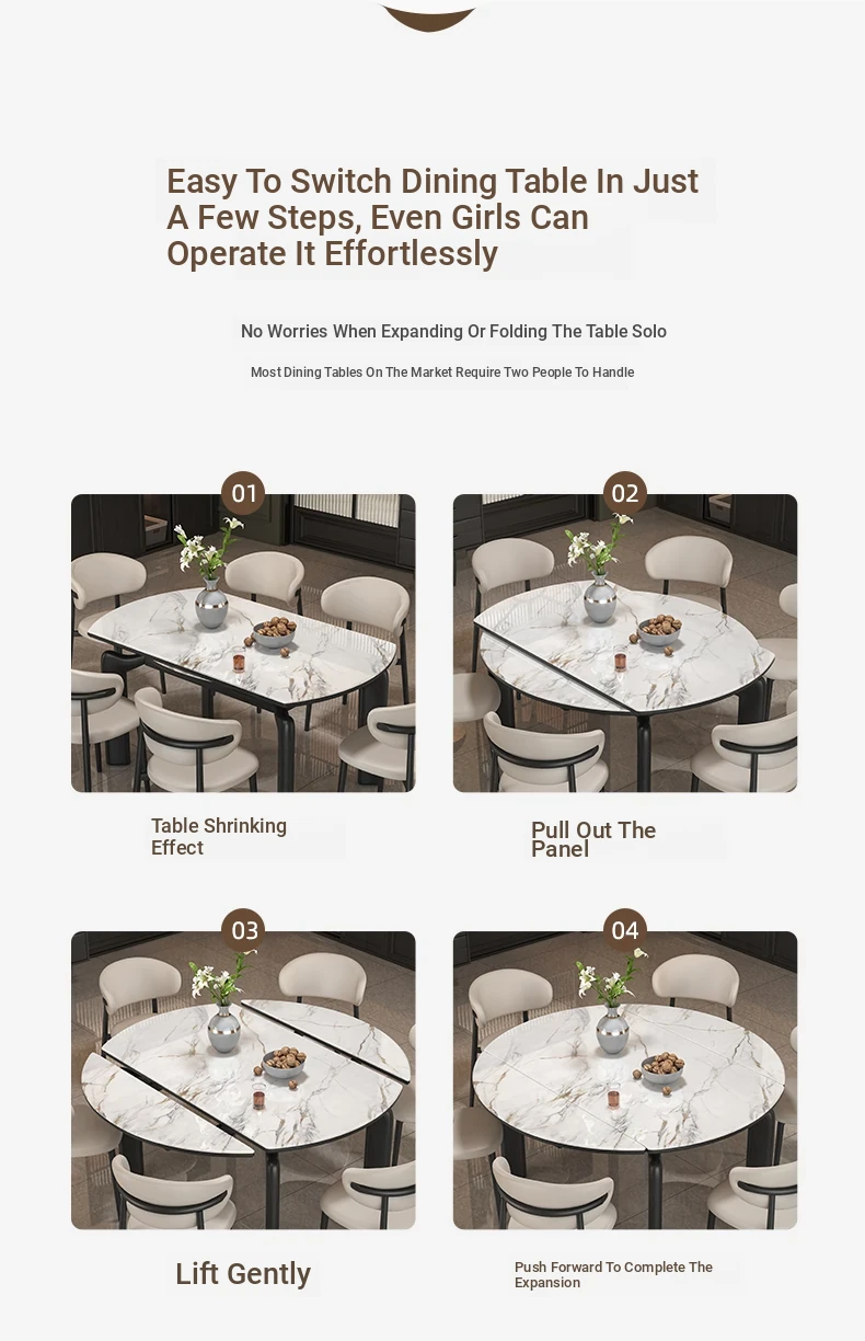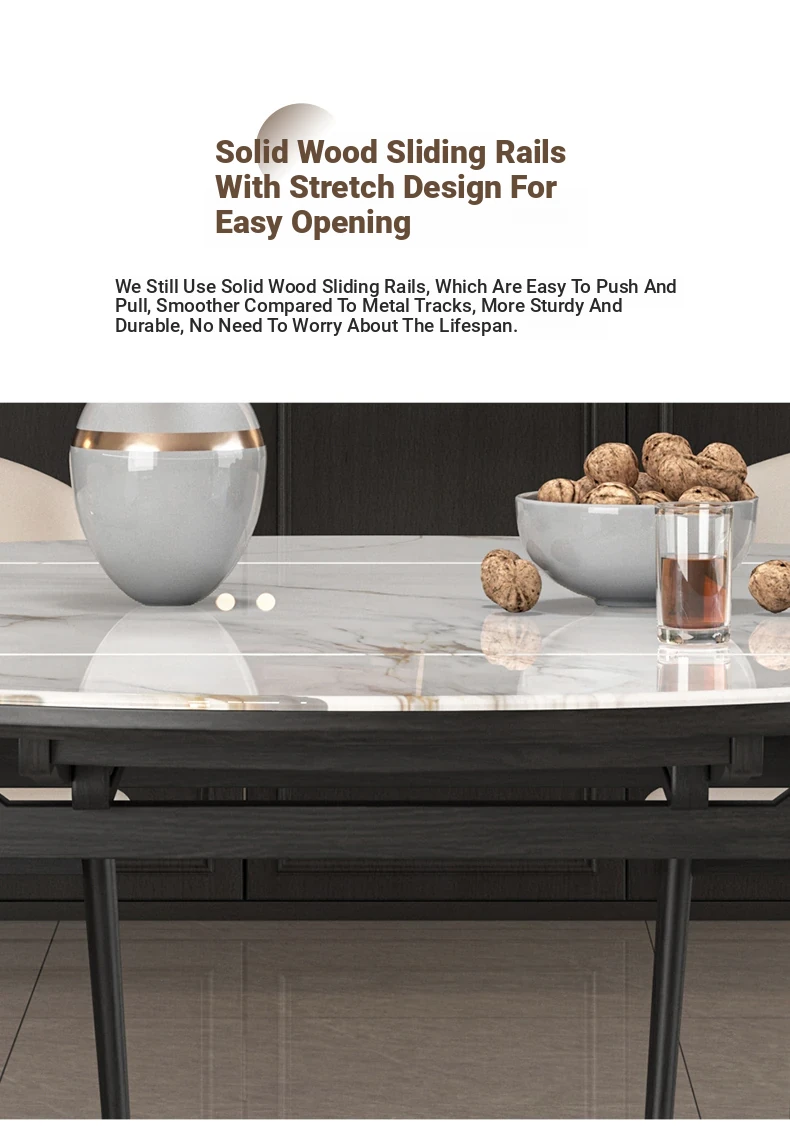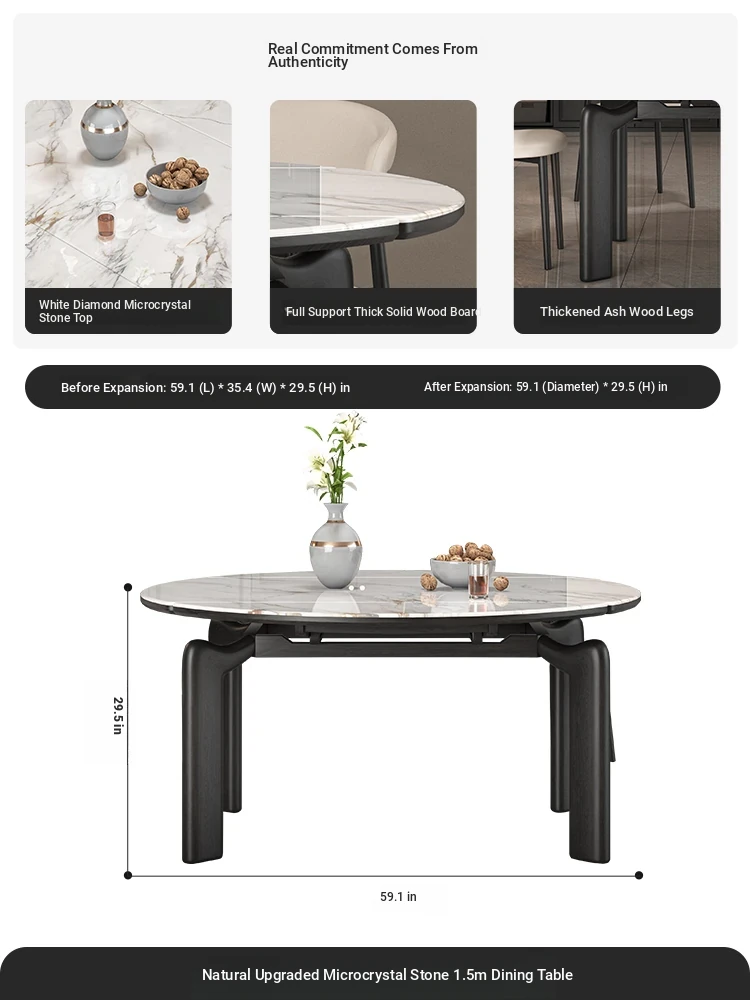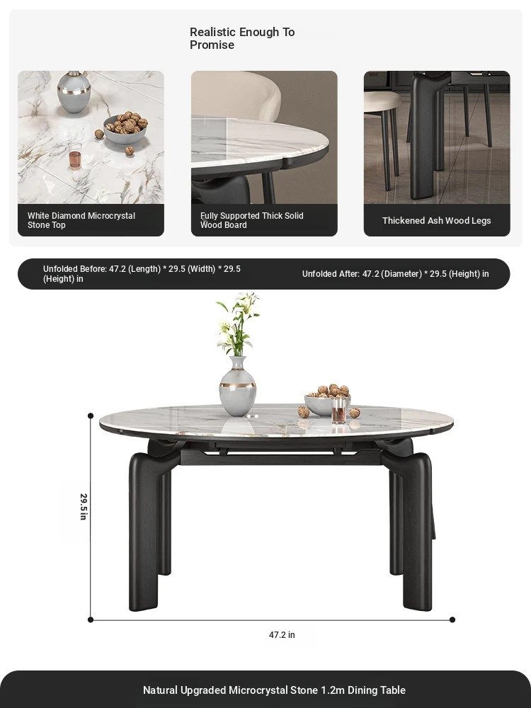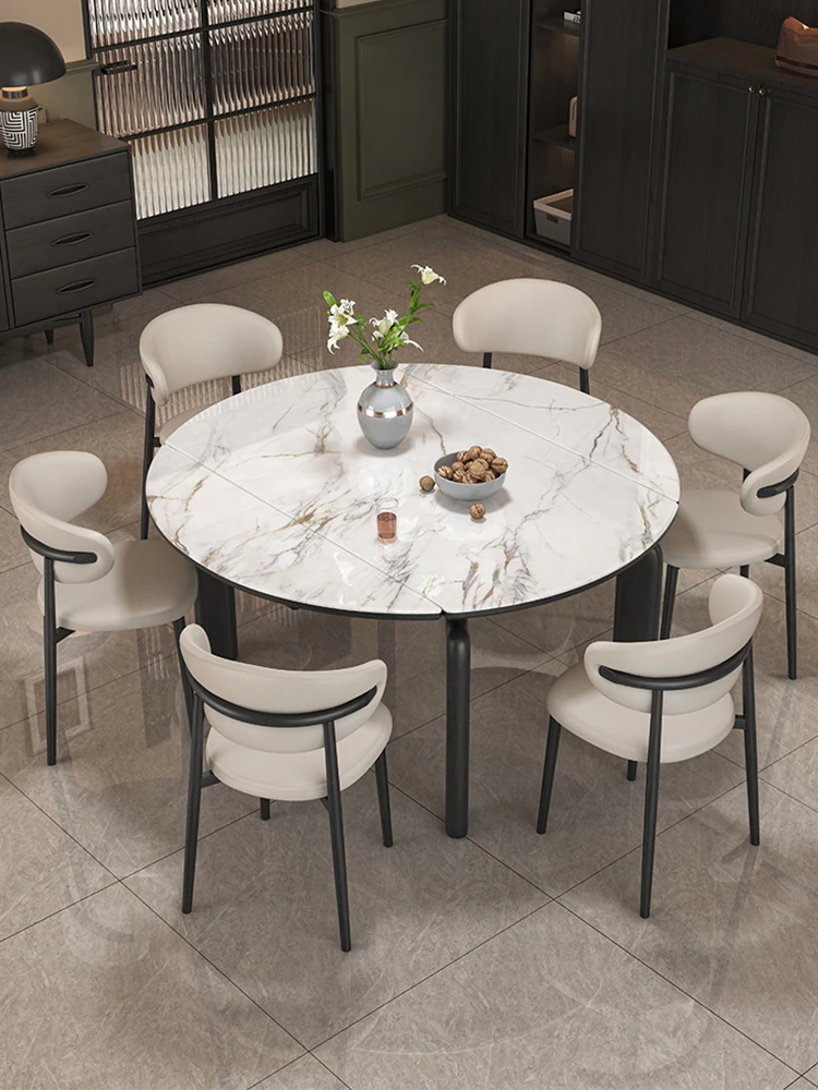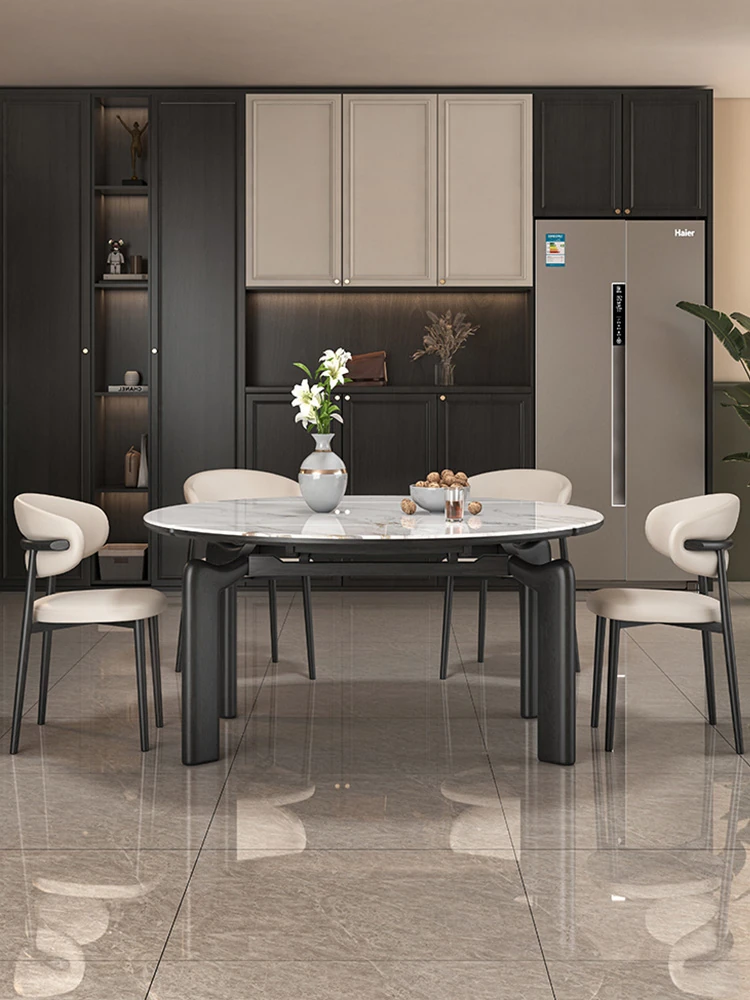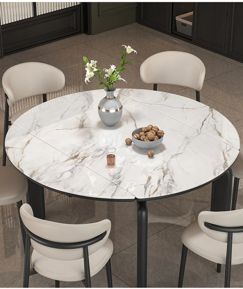French Vintage Luxury Retractable Round Dining Table with Natural Microcrystalline Stone and Marble Top - Perfect for Small Spaces and Elegant Interiors