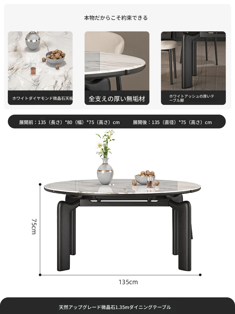 1.35M天然マイクロクリスタル石伸縮ダイニングテーブル+4チェア(デザイナーコーディネート)