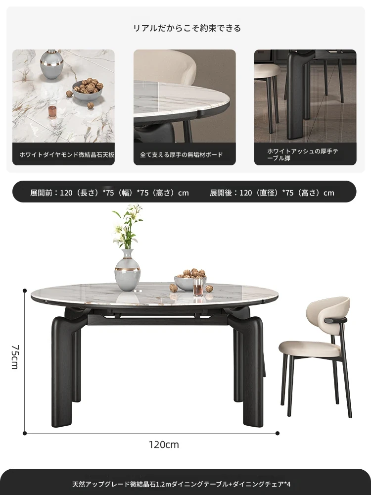 1.2M天然マイクロクリスタル石伸縮ダイニングテーブル+4チェア(デザイナーコーディネート)