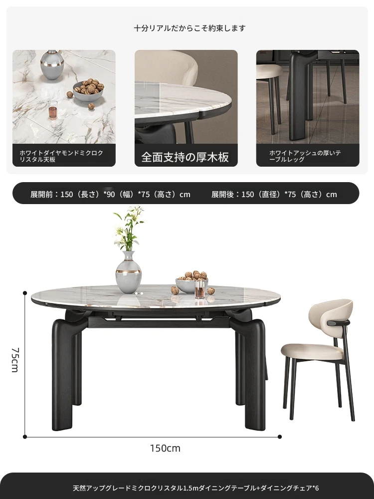 1.5M天然マイクロクリスタル石伸縮ダイニングテーブル+6チェア(デザイナーコーディネート)