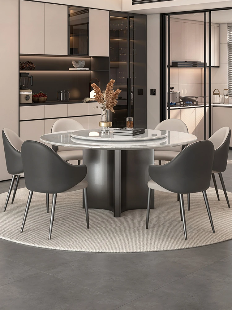 1.3キャリーバーレイパールストーンダイニングテーブル+回転台+本革椅子*6