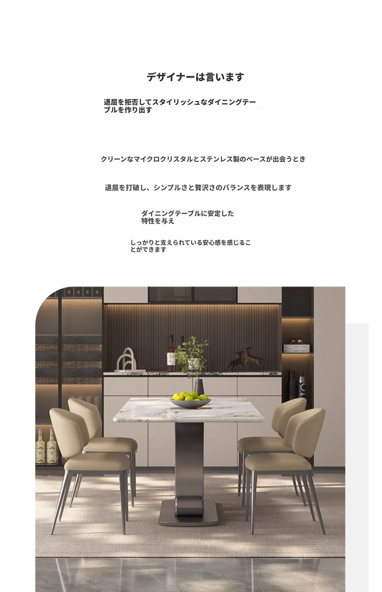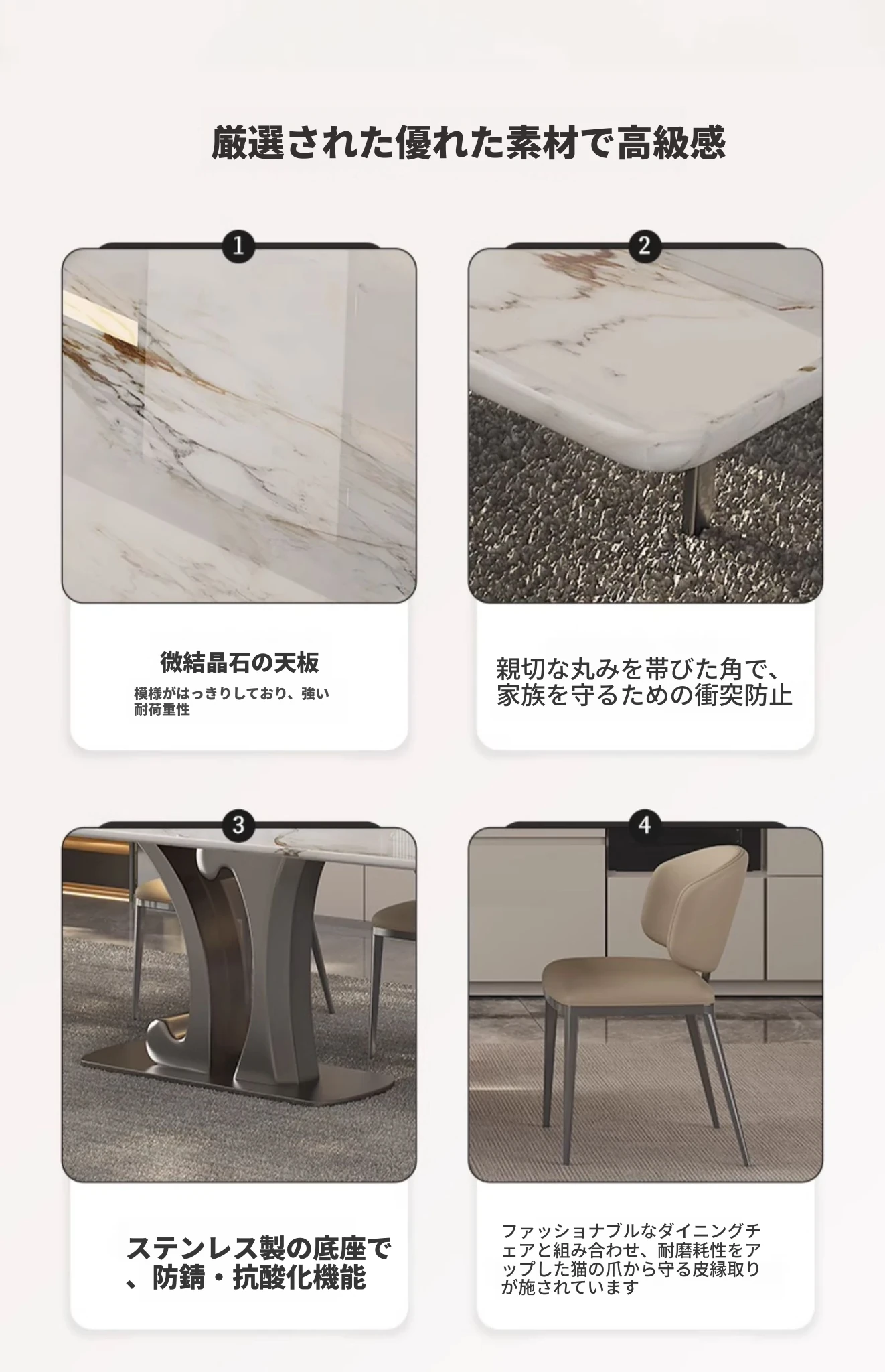1.4天然ミクロ結晶石ダイニングテーブル+猫の爪を引っかけるレザーのダイニングチェア*4