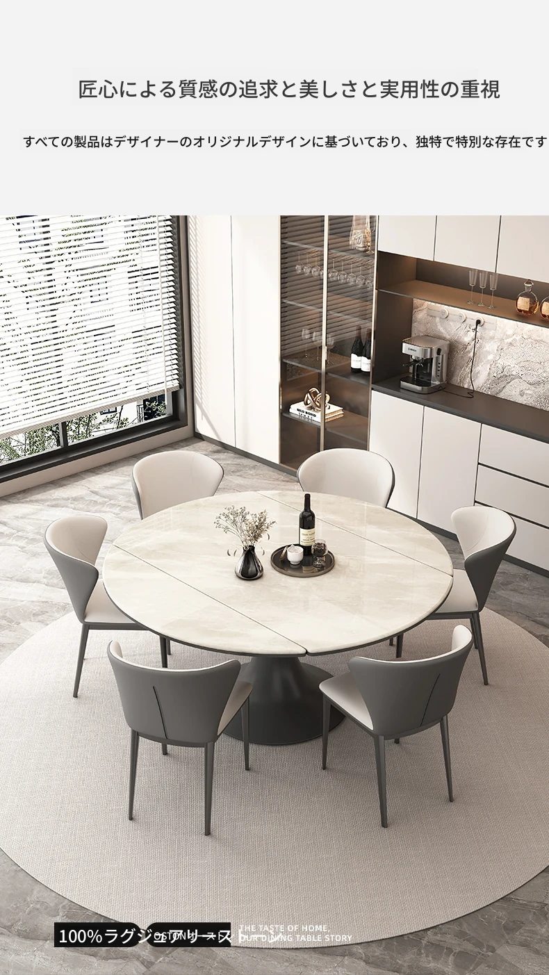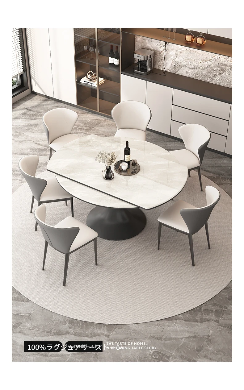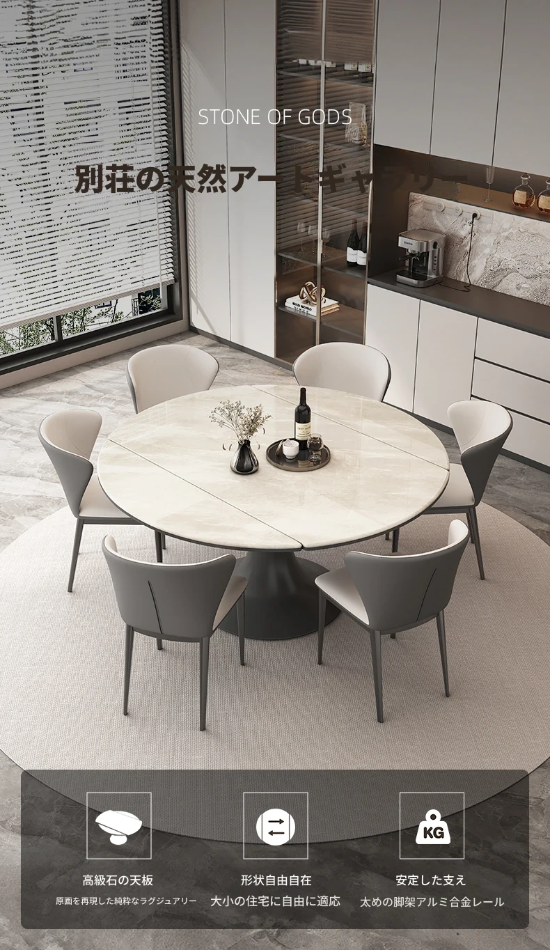 伸縮可能なモダンデザインの高級感あふれるロックボードダイニングテーブル。小型スペースにも最適な丸型テーブルと椅子のセットで、スタイリッシュな食卓を実現!