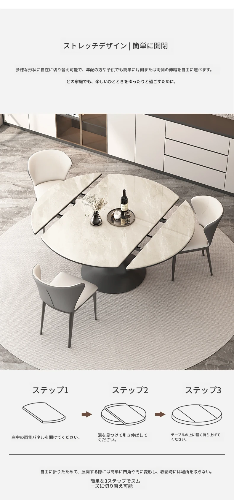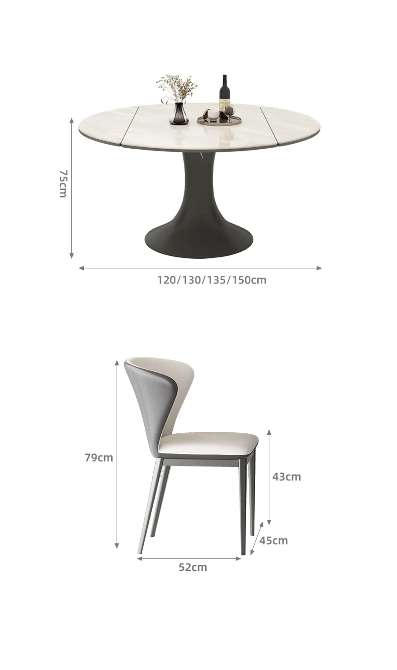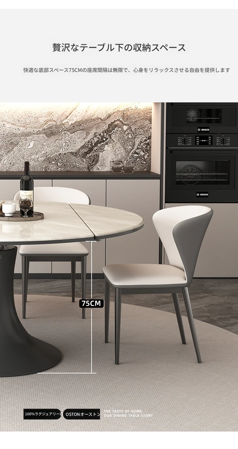 伸縮可能なモダンデザインの高級感あふれるロックボードダイニングテーブル。小型スペースにも最適な丸型テーブルと椅子のセットで、スタイリッシュな食卓を実現!