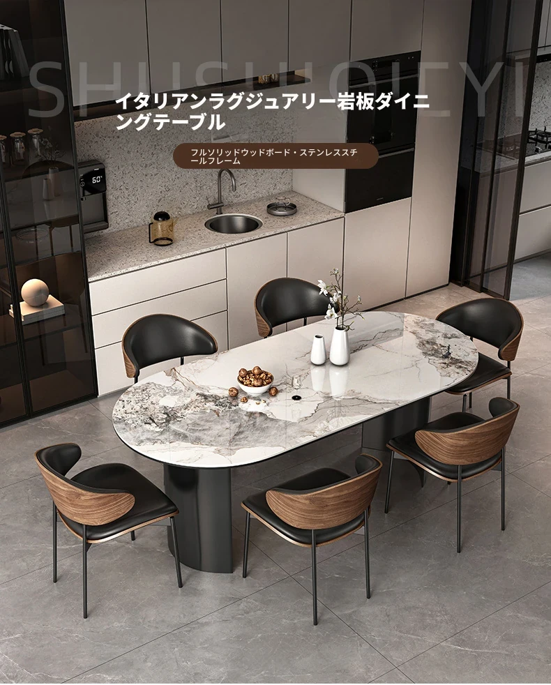 1.8メートル岩板ダイニングテーブル(アップグレード全支持耐荷重板)+猫爪レザー製ダイニングチェア*6