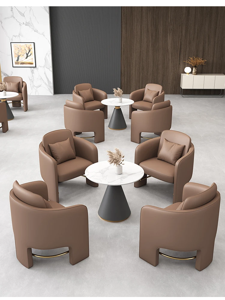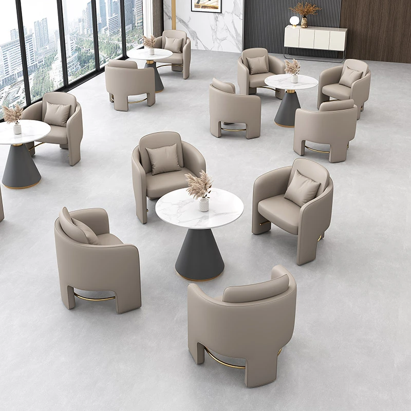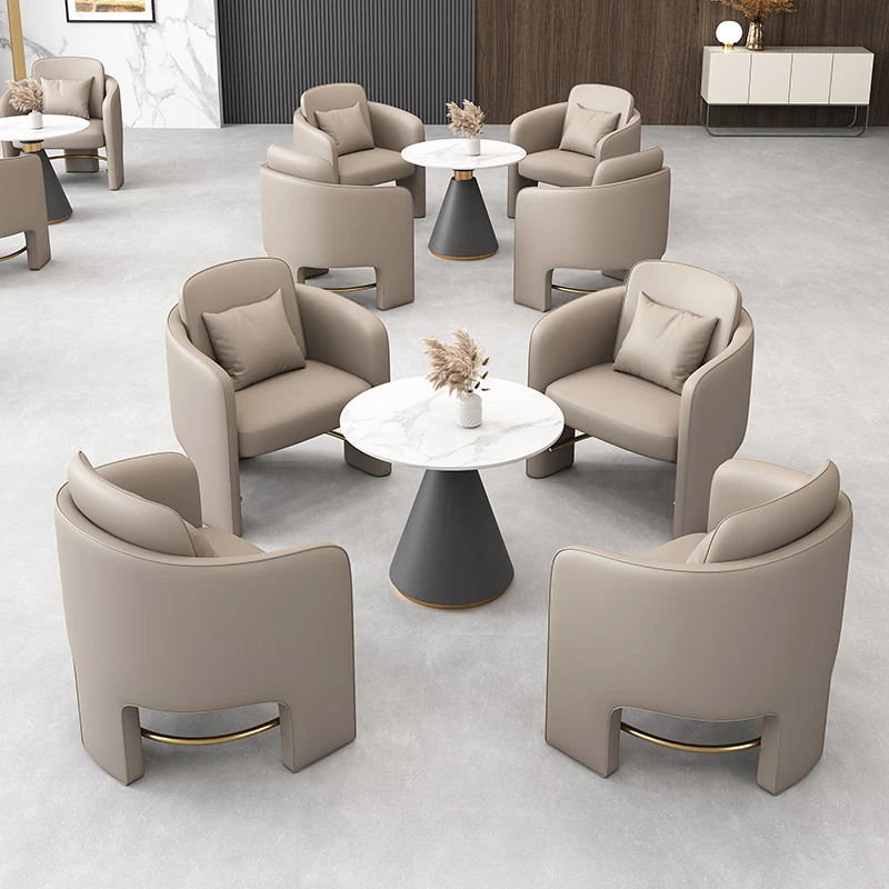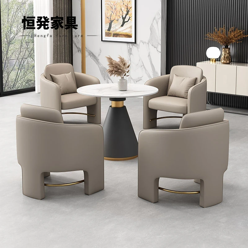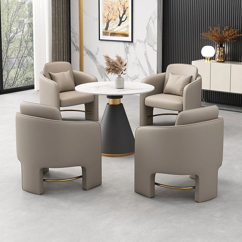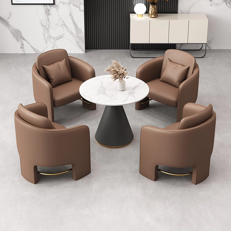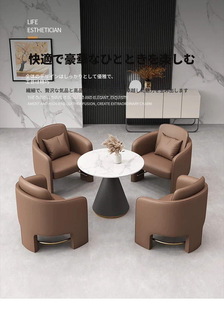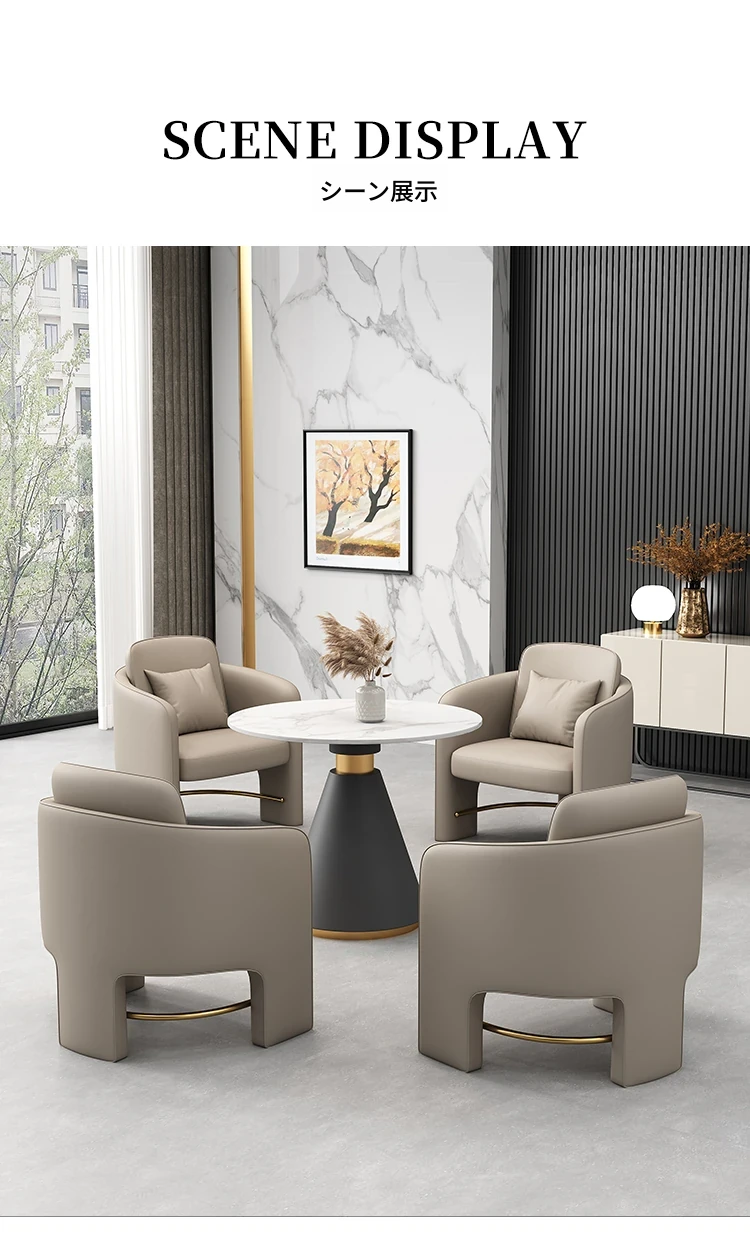 不動産販売所に最適!快適な休憩エリアを演出する4脚付き小丸テーブルセット。ホテルの商談や接客にぴったりな洽談テーブル&椅子のコンビネーション。おしゃれで機能的、ビジネスシーンをサポートします!
