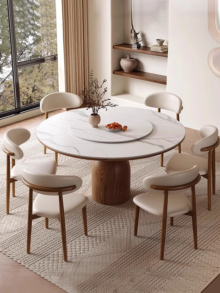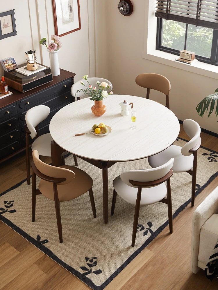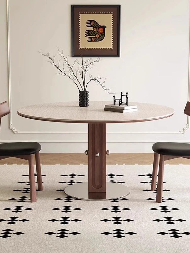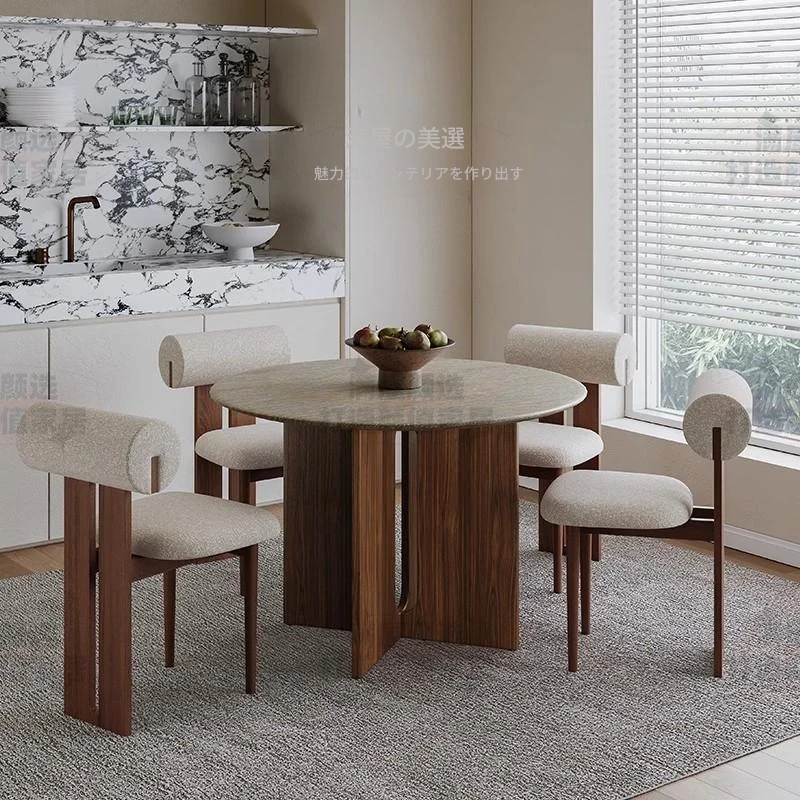 フランス風ヴィンテージスタイルの洞石岩板ラウンドテーブル!小スペースにピッタリなウォールナット色の天然木製円形ダイニングテーブル&チェアセット。おしゃれで実用的な回転盤付き!どんなインテリアにもマッチします。