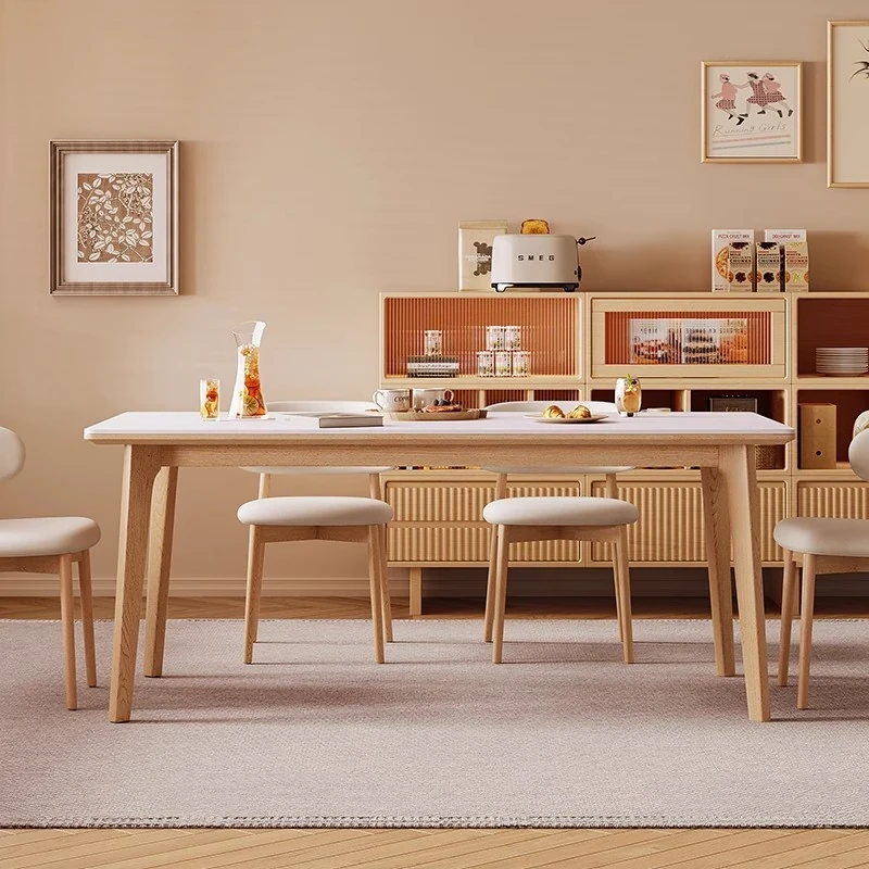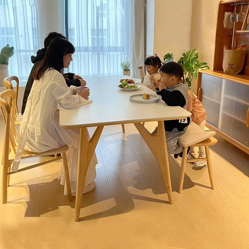 天然木材のロックボードダイニングテーブルセット - モダンでシンプルなデザイン、小スペース向けのナチュラルクリームトーンの長方形テーブル。家族や友人との食事に最適なアイテムです!