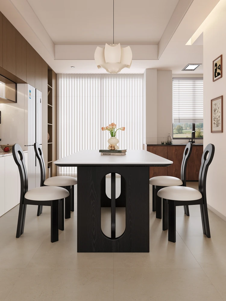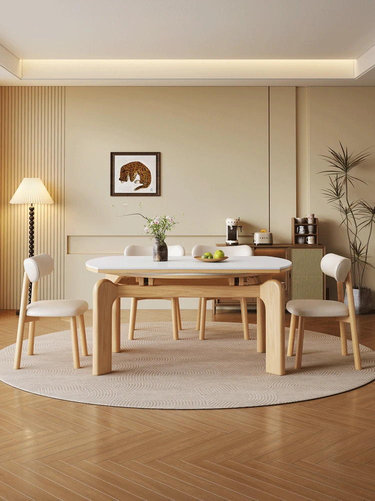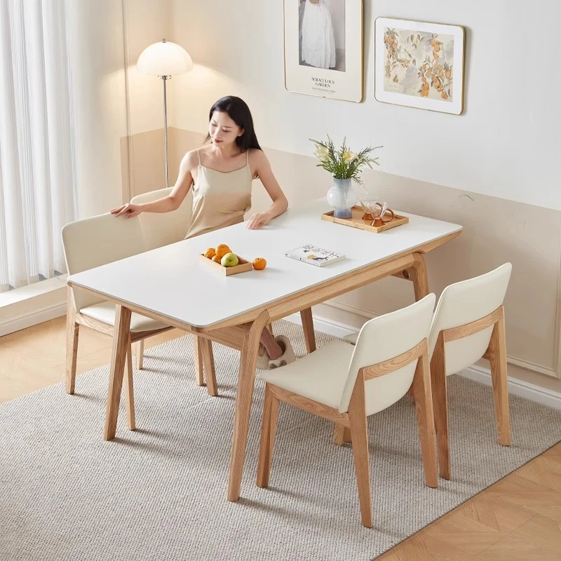 2025年新作!クリーム風の小型家用実木ロックボード長方形ダイニングテーブル&チェアセット - ホワイトアッシュ材使用、おしゃれで機能的、少ないスペースでも素敵な食卓を演出!