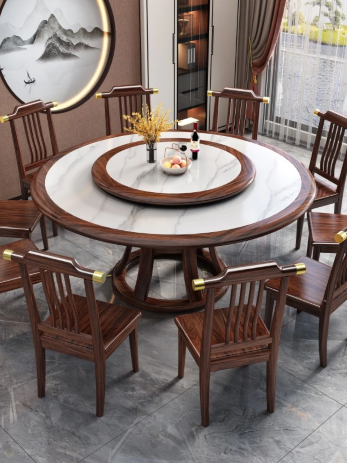 新中式スタイルのウ金木製実木テーブルと椅子のセット - 10人用、ホテルや家庭での食事に最適!回転式の大きな円卓で、家族や友人との楽しいひとときを演出します。